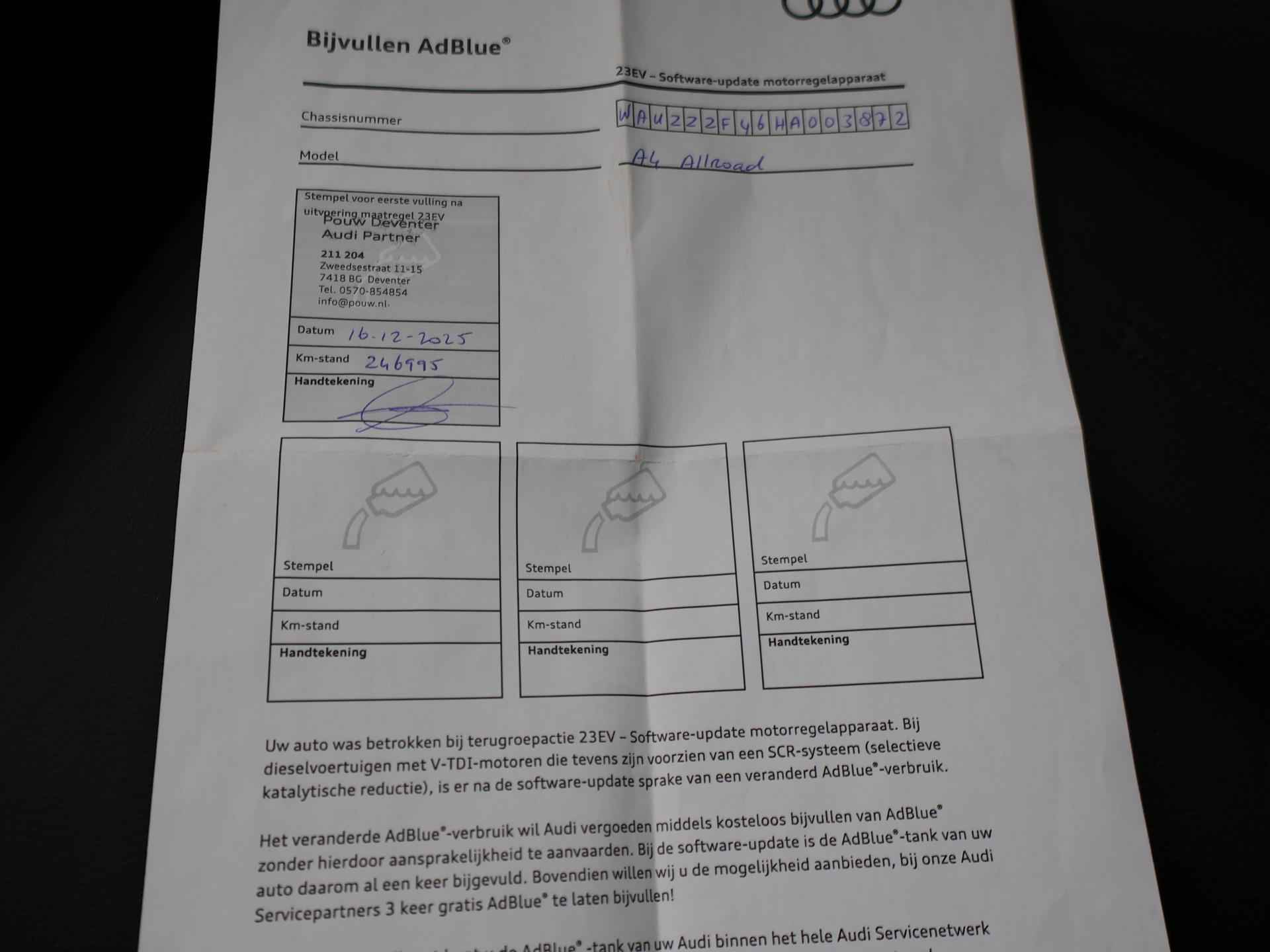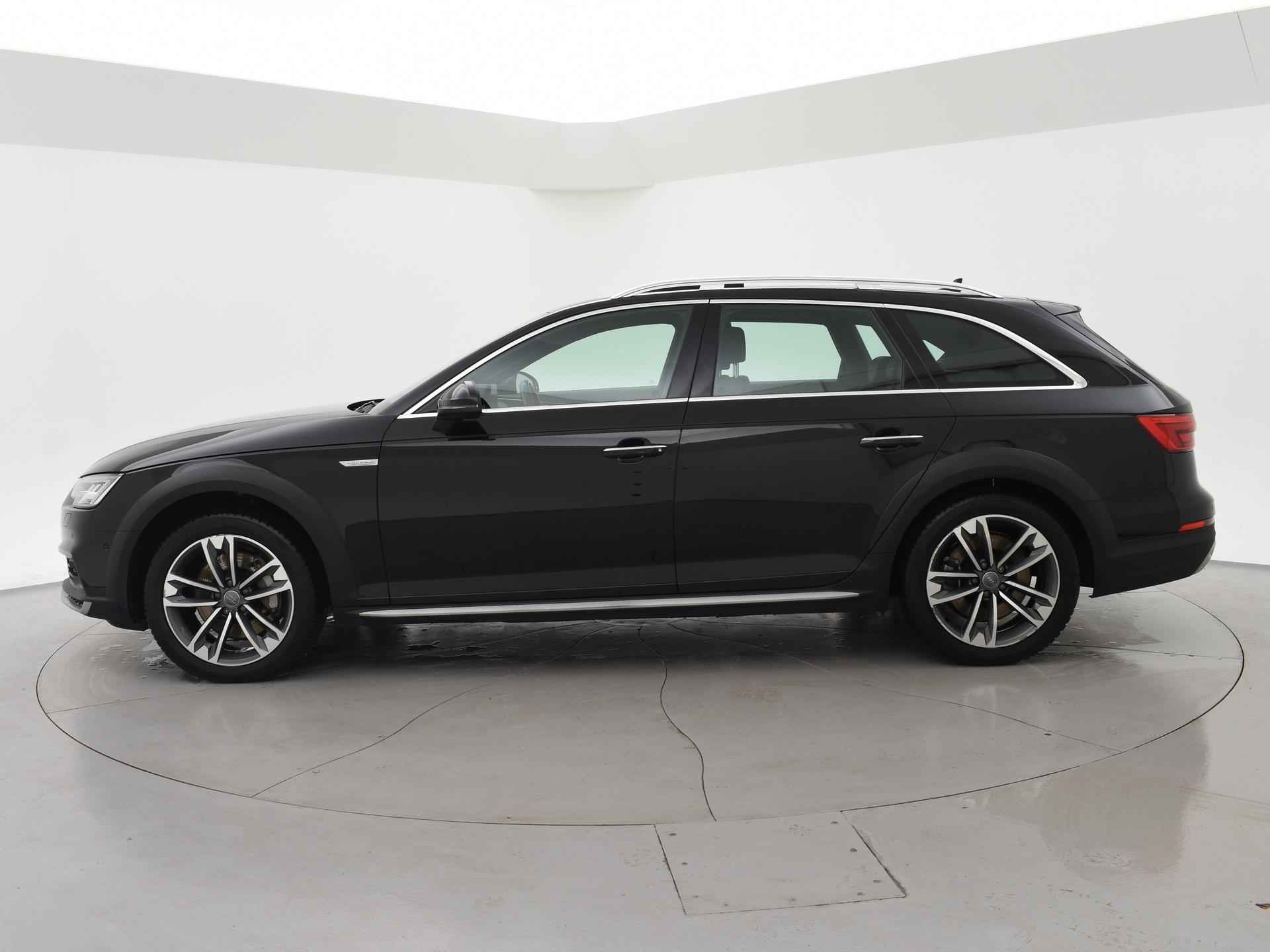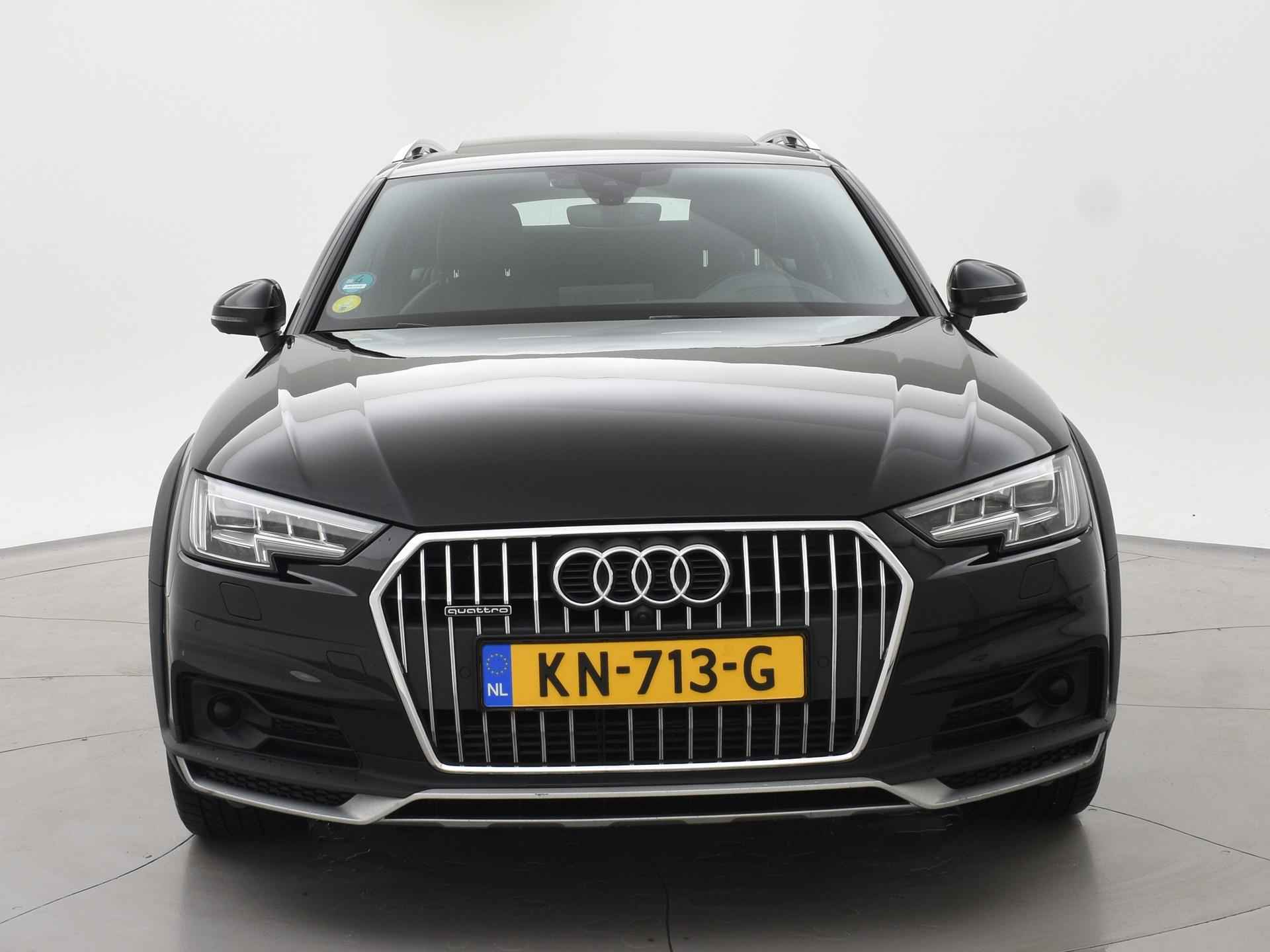Bijzondere auto: A4 Allroad Quattro 3.0 TDI V6 272 PK Automaat met een RDW nieuwprijs van 100.002 euro en dat is wel te zien aan de uitgebreide optielijst: Bang & Olufsen premium sound, Panorama schuif/kanteldak, Head-up display, Sfeerverlichting interieur, Zwart lederen sportstoelen, 360 graden surroud view camerasysteem, Elektrisch wegklapbare trekhaak met 1900 kg trekgewicht op kenteken, Virtual cockpit digitale cockpit met verschillende tellerweergave mogelijkheden en navigatie kaartweergave modus, Apple Carplay / Android Auto appstreaming Google Maps, Flitsmeister, Whatsapp etc, Adaptive cruise control met automatisch afstand houden en lijnassistentie, 18 inch lichtmetalen velgen, Stoelverwarming, Keyless entry en keyless-drive, Elektrische achterklep, Full LED koplampen, LED achterlichten, Elektronisch kinderslot, Elektrisch inklapbare buitenspiegels, Audi Drive Select regelbare rij-eigenschappen, Thuiskomer reservewiel, 3-zone climate control met aparte bediening achterin, DAB+ Digitale radio, Draadloze telefoonlader. Exterieurkleur Mythoszwart metallic.