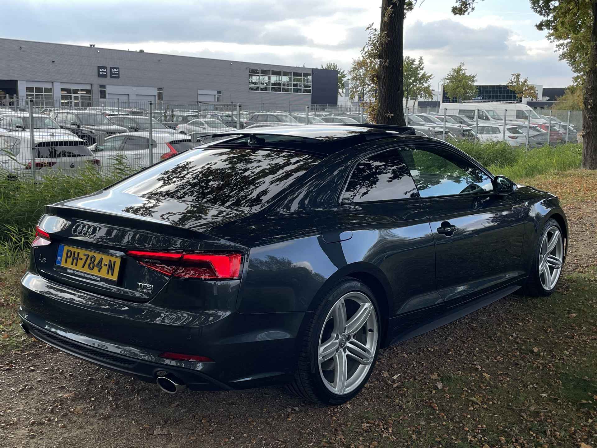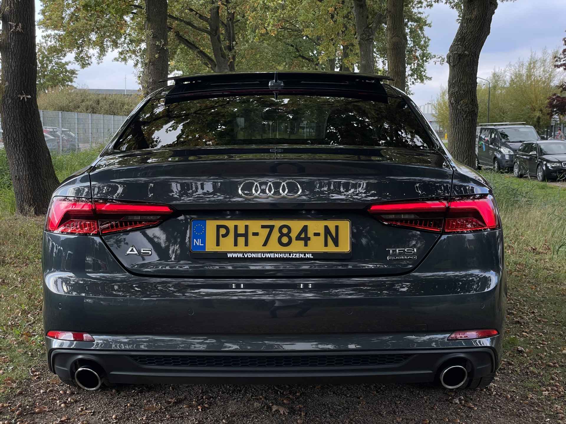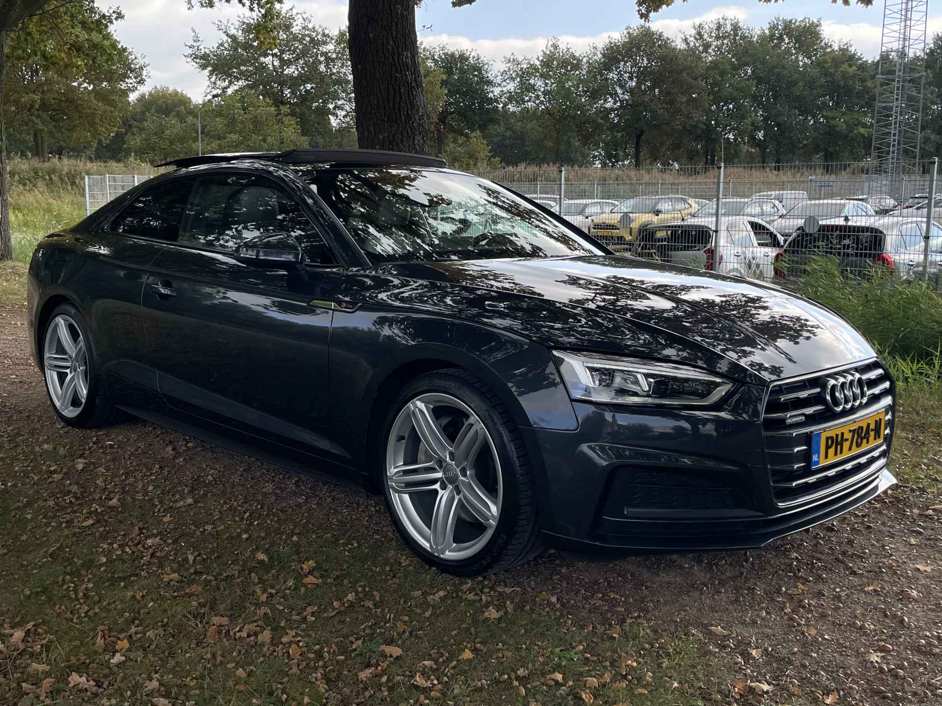 De Audi A5 Coupé is gebouwd met hoogwaardige techniek en maakt het rijden van lange ritten, maar ook korte stukjes, tot een feestje. De S-Line styling geeft dit model een elegante en opvallende uitstraling. De krachtige benzinemotor staat garant voor uitstekende prestaties. Uitstekende zitsteun en een strakke look? Daar zorgen de sportstoelen voor! Dankzij het elektrisch bediende glazen panoramadak lijkt het of u altijd met open dak rijdt. Natuurlijk behoren 19 inch lichtmetalen velgen, LED koplampen, sportonderstel, halflederen bekleding, warmtewerend glas en in delen neerklapbare achterbank ook tot de uitrusting van deze complete auto.