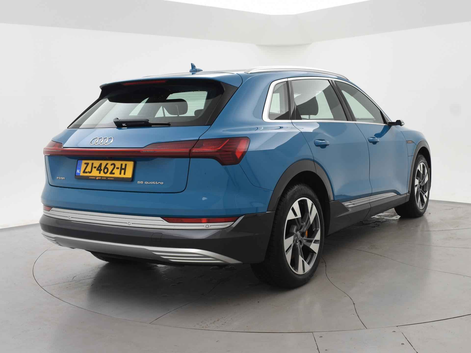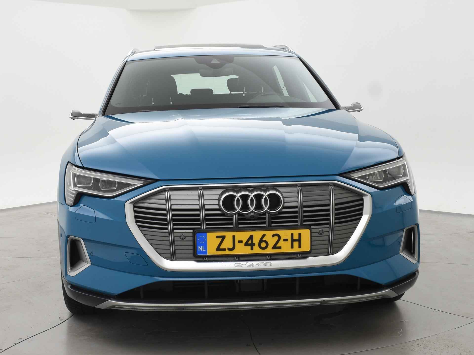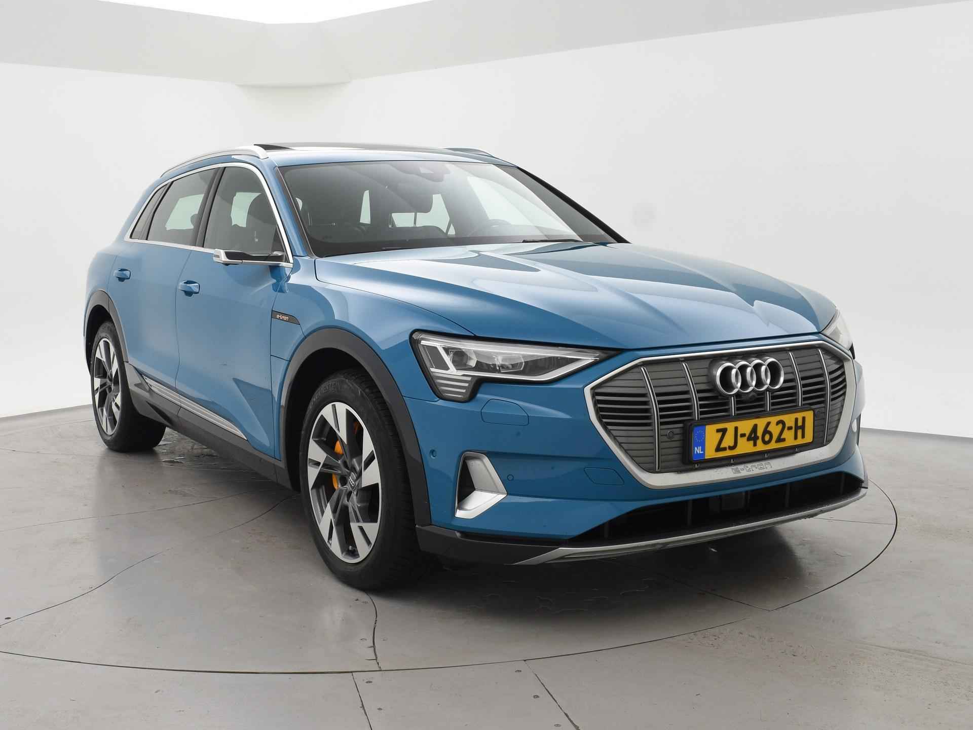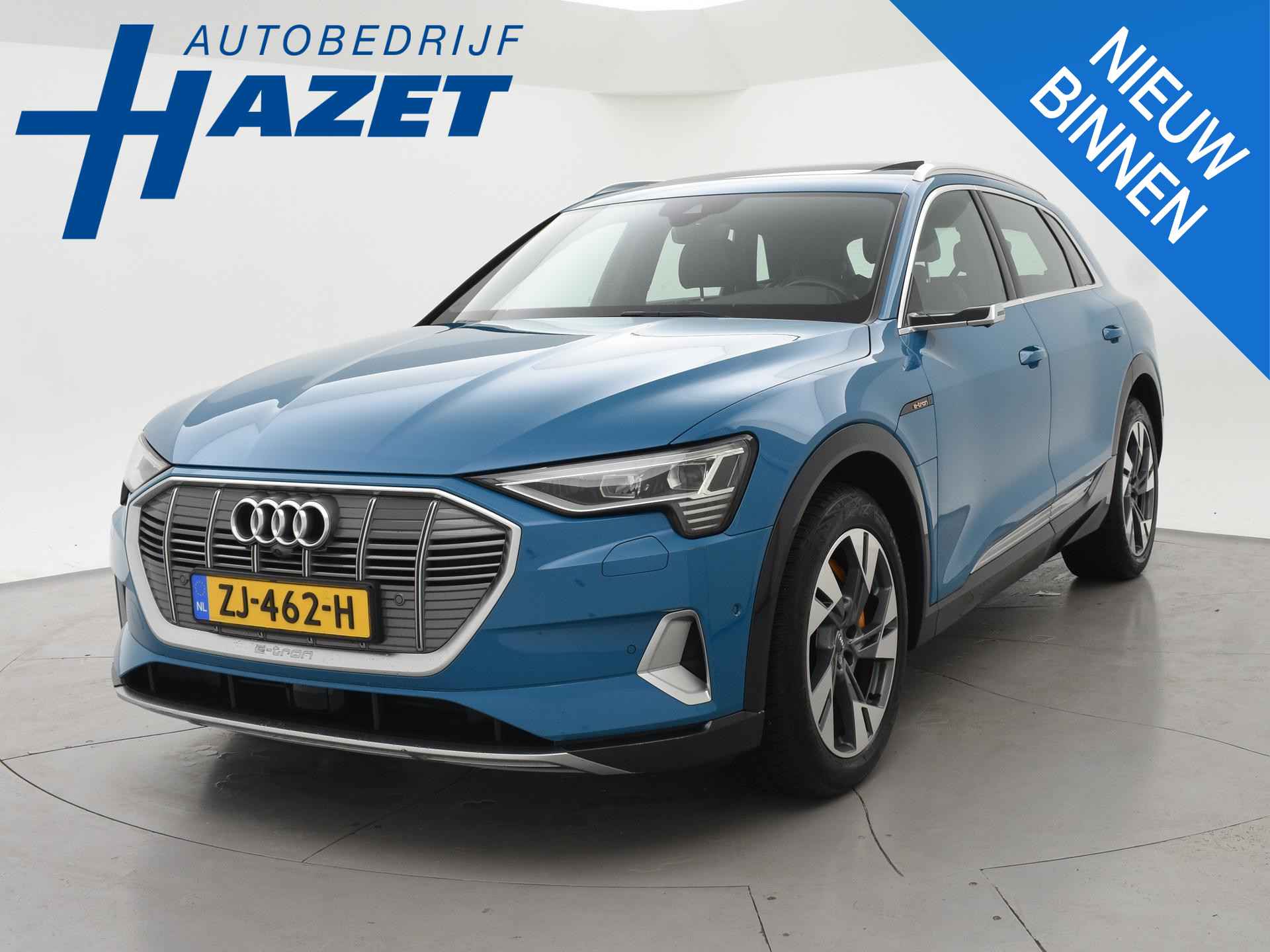 Edition One uitvoering - de introductie uitvoering van de E-Tron met zeer veel extra's en die het meest de introductiekleur Antiguablauw metallic uitgegeven is met oranje remklauwen origineel vanaf fabriek. E-Tron 55 408 PK Quattro, BTW verrekenbaar, prijs is inclusief BTW. Zwart volledig leder sportinterieur met stoelverwarming, 4-Corner Luchtvering met regelbare rijhoogte, Sfeerverlichting interieur met verschillende kleuren, Bang & Olufson premium sound, Panorama schuif/kanteldak, 360 graden surround view camerasysteem, Navigatie, Adaptive cruise control, Cameraspiegels, Parkeersensoren voor en achter, Elektrische stoelverstelling, Zwarte hemelbekleding, Keyless-entry en keyless-drive, Elektrische achterklep, Full LED koplampen, LED achterlichten, Chromen raamlijsten en dakrailing, Apple Carplay / Android Auto, 4-zone climate control, Elektronisch kinderslot. Bijzonderheden: Deze auto kan wel gewoon aan de laadpaal laden, maar niet aan de snelladers zoals Fastned. Dit komt door een isolatiestoring die het snelladen beveiligd. De oplossing hiervoor is ons niet bekend, wij verkopen de auto in de huidige staat.