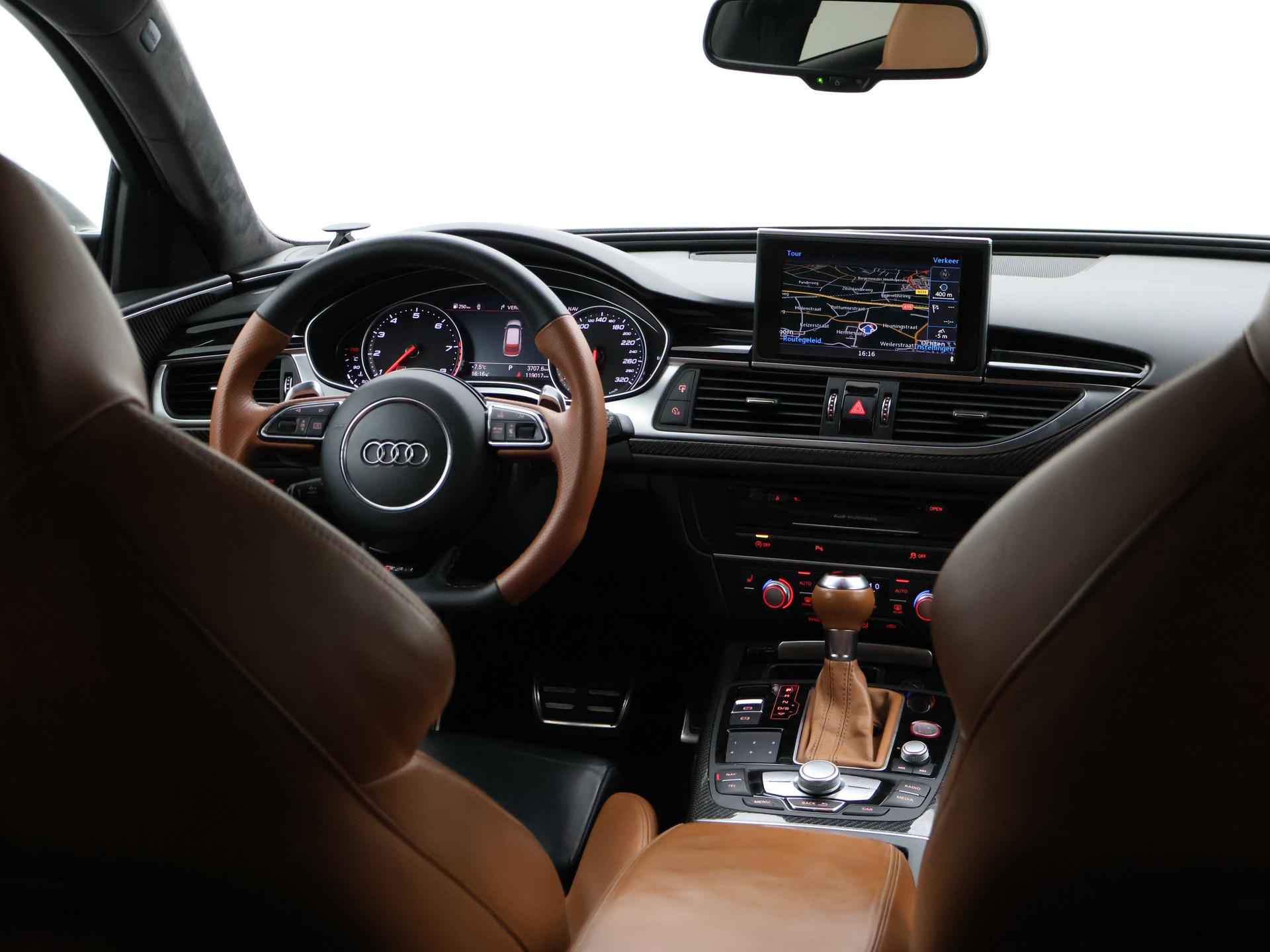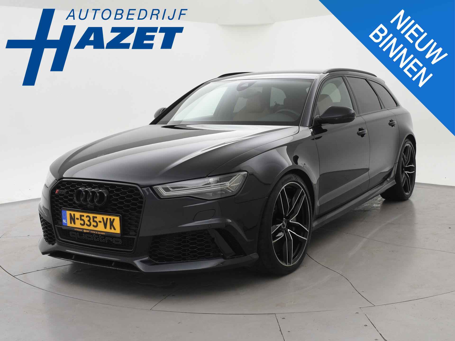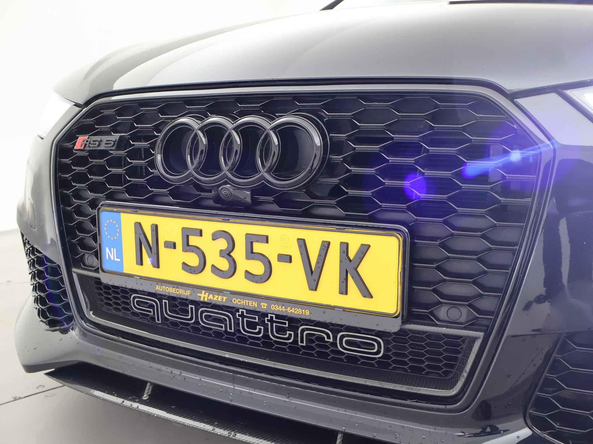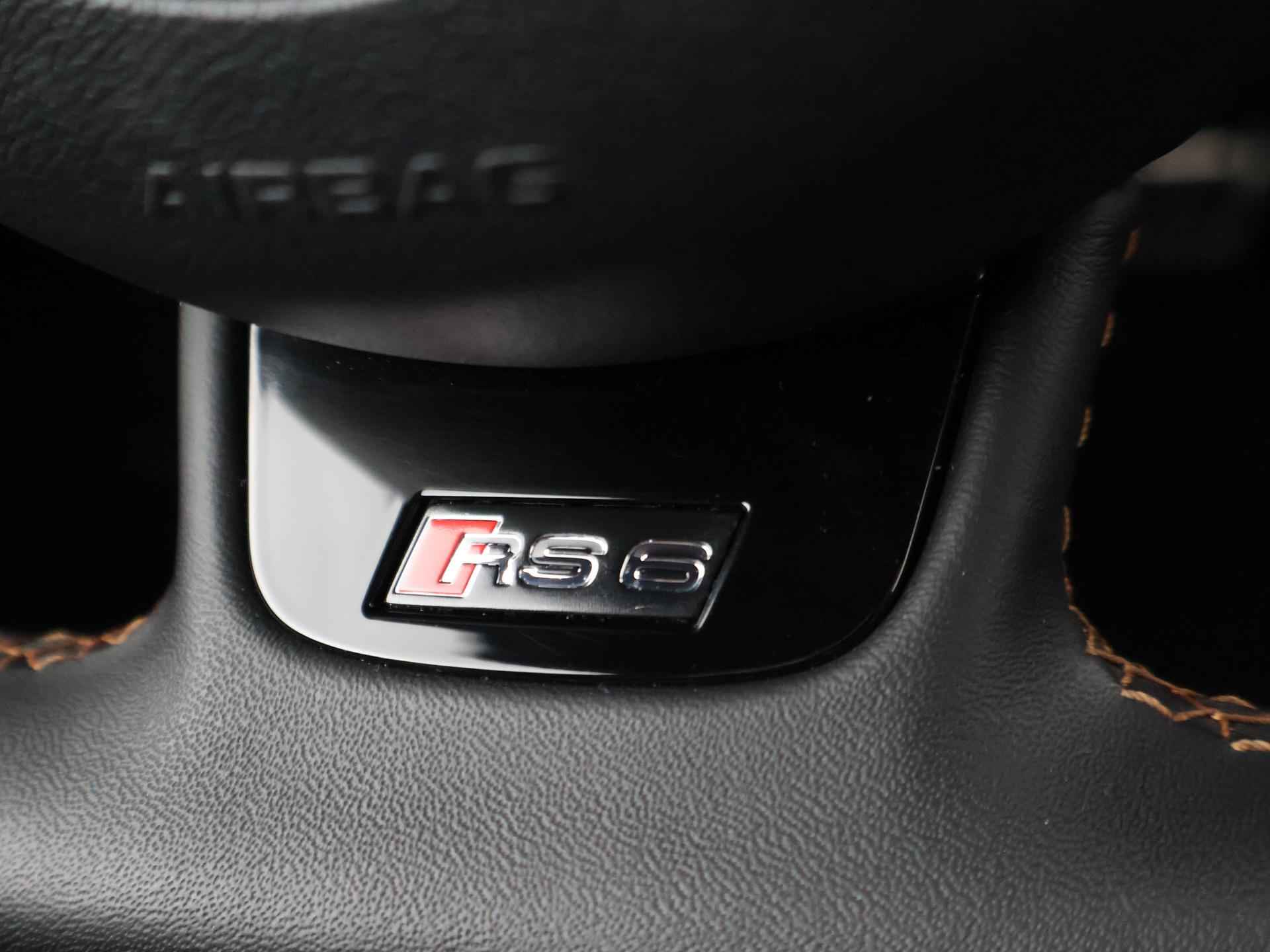 Audi RS6 4.0 TFSI V8 Bi-Turbo Performance met 605 PK vermogen en Quattro vierwielaandrijving, Audi Ceramic Brakes dus Keramische remmen, Audi Exlusive interieur met exclusive bi-color leder interieur + stoelen + middentunnel leder, Bang & Olufsen High End audio, Carbon interieur + exterieur styling, Carbon diffuser achterbumper, Carbon dashboard inleg, Carbon middentunnel, Privacy glass, 360 graden rondomzicht camera, Cruise control, 4-zone climate control, Zwarte alcantara hemelbekleding, LED koplampen, LED achterlichten, Elektrische achterklep, Keyless-entry en keyless-drive, Elektrische stoelverstelling met geheugen, Zwarte grille en logo's rondom, Achterspoiler, in 09-2025 bij 113.999 km nog onderhoud gehad.