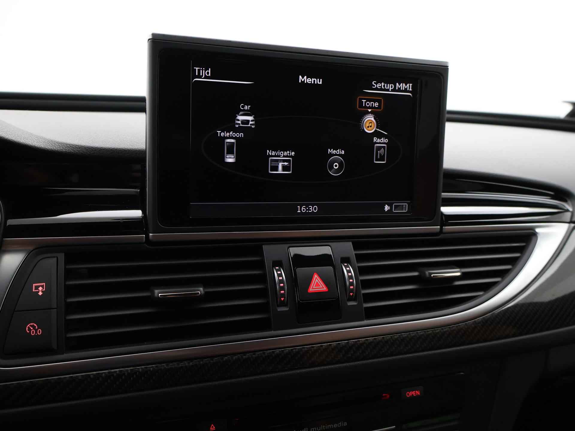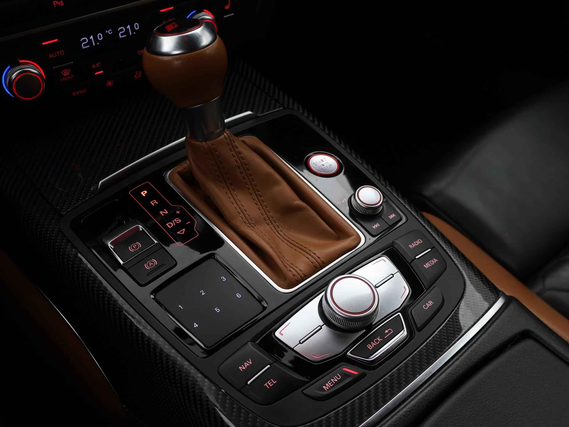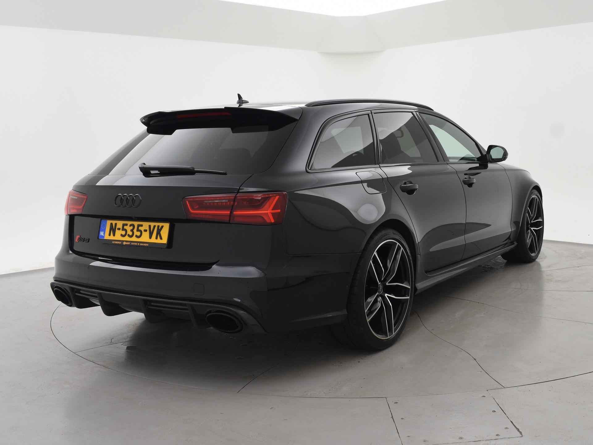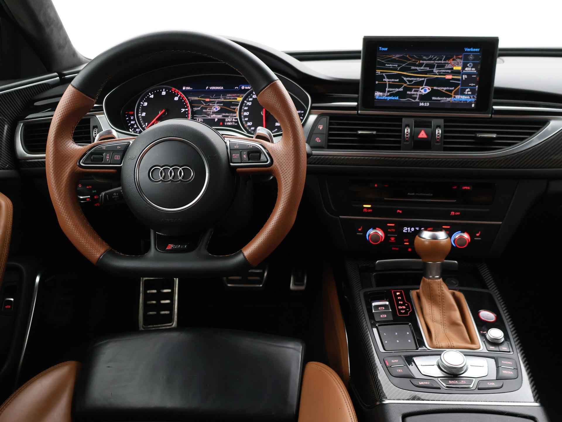 Audi RS6 4.0 TFSI V8 Bi-Turbo Performance met 605 PK vermogen en Quattro vierwielaandrijving, Audi Ceramic Brakes dus Keramische remmen, Audi Exlusive interieur met exclusive bi-color leder interieur + stoelen + middentunnel leder, Bang & Olufsen High End audio, Carbon interieur + exterieur styling, Carbon diffuser achterbumper, Carbon dashboard inleg, Carbon middentunnel, Privacy glass, 360 graden rondomzicht camera, Cruise control, 4-zone climate control, Zwarte alcantara hemelbekleding, LED koplampen, LED achterlichten, Elektrische achterklep, Keyless-entry en keyless-drive, Elektrische stoelverstelling met geheugen, Zwarte grille en logo's rondom, Achterspoiler, in 09-2025 bij 113.999 km nog onderhoud gehad.