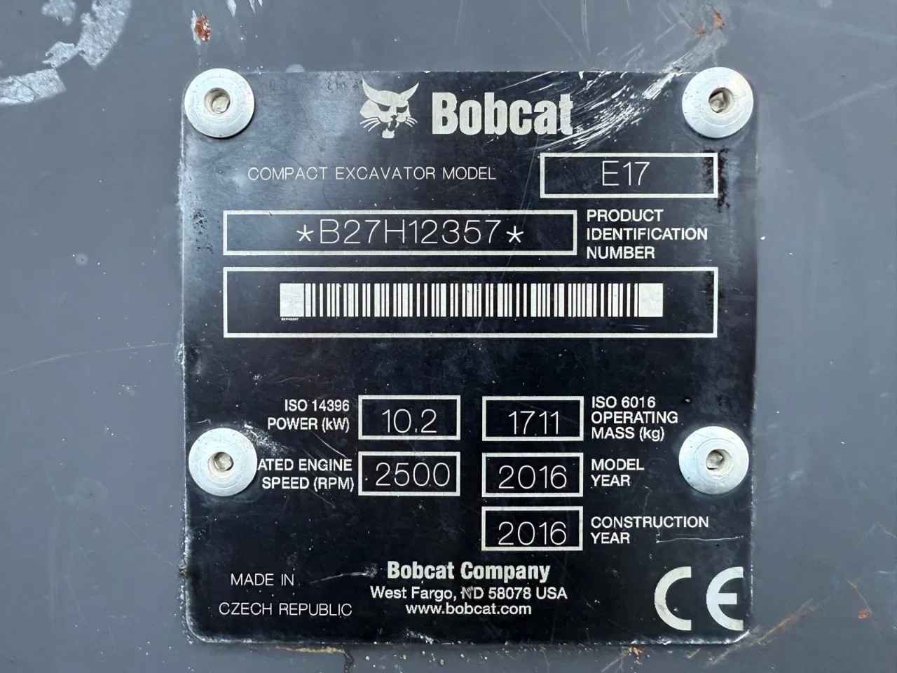 Bobcat E17 2016 3035 hours 1711 kg 10,2 kW Extra hydraulic function Quick coupler MS01 1x Bucket 40cm