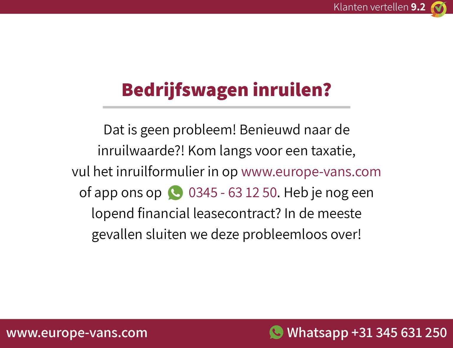 Inruil van uw huidige bedrijfswagen is mogelijk. Financial lease behoort tot de mogelijkheden, op onze site vindt u de tarieven en kunt u direct een aanvraag doen. Alle prijzen zijn exclusief 21% BTW tenzij anders vermeld. Informeer naar aanvullende voorwaarden bij particuliere verkoop. EXPORT: As official VWE-exportpartner we provide all needed documents and services.