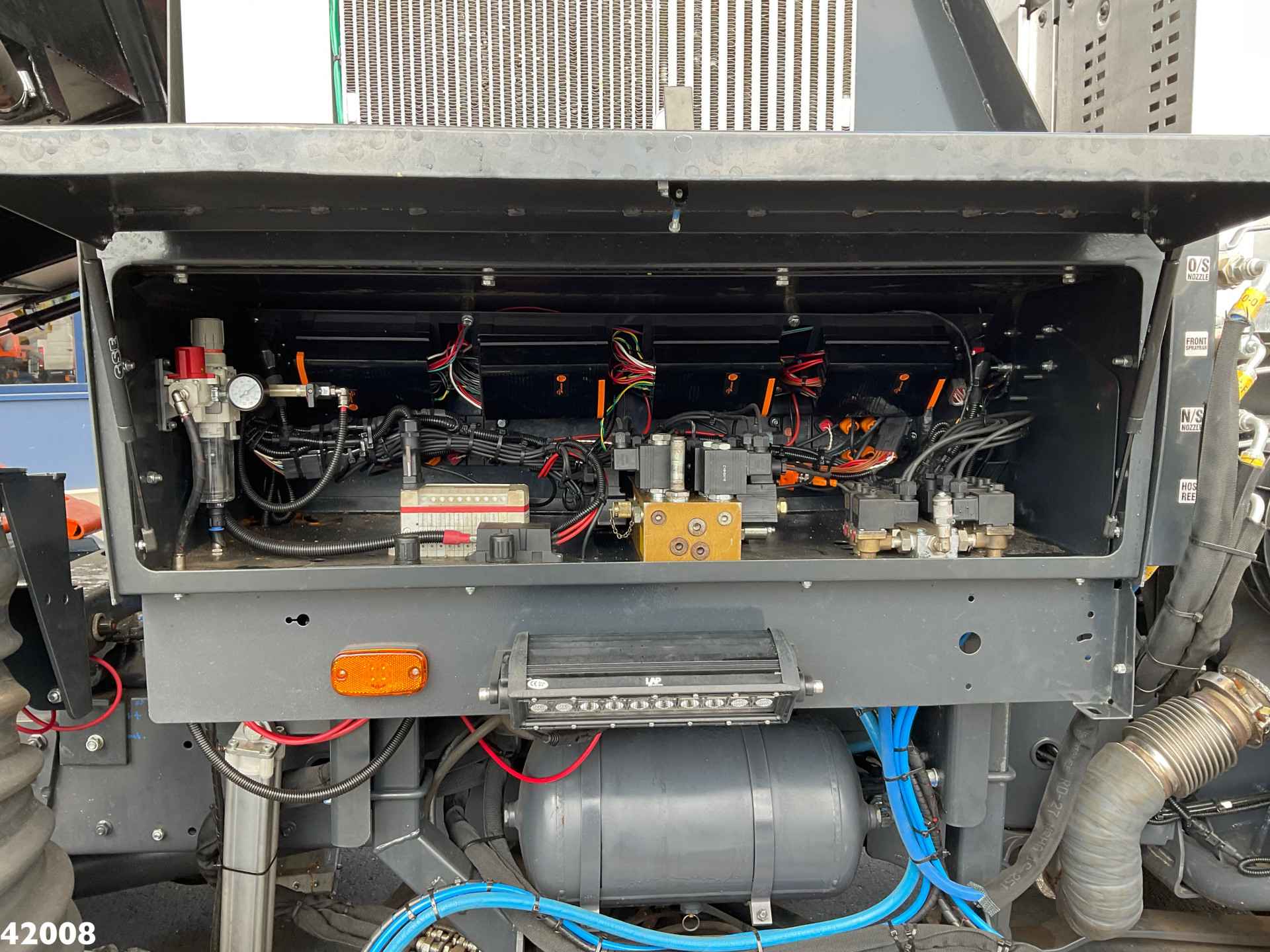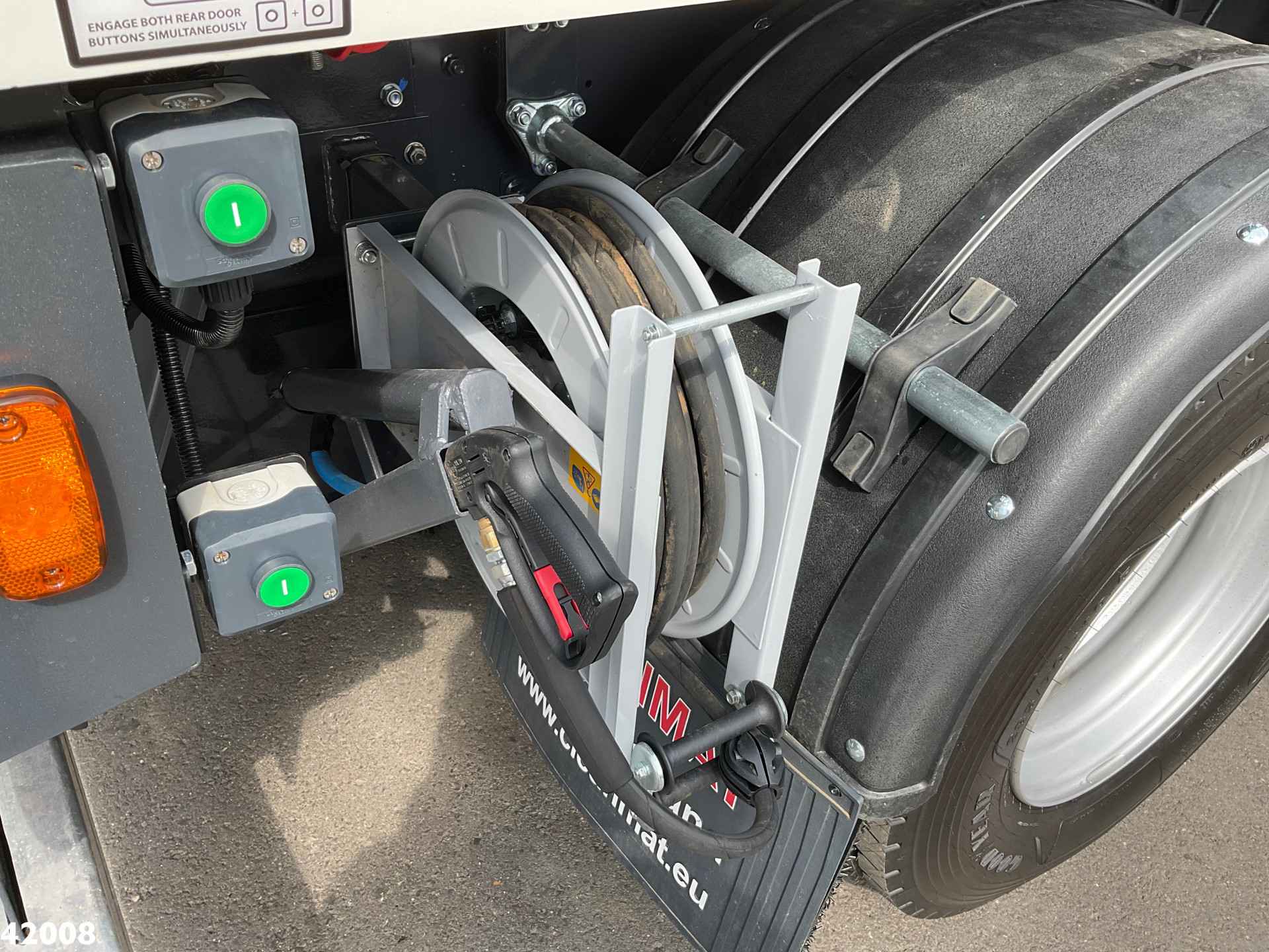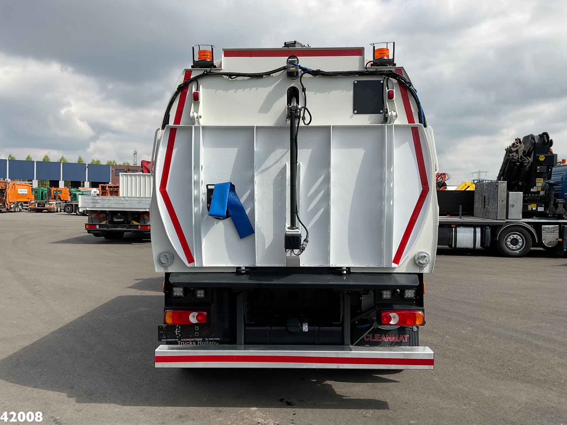 • Twee oranje roterende zwaailampen achter op hopper