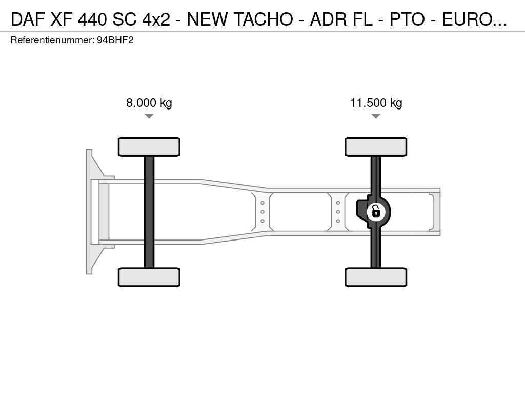For sale : Daf XF 440 Space Cab 4x2 - NEW TACHO - ADR FL - 05-2015 Euro 6 567.000 km Aut gearbox Airconditiong Cab heater Differential lock Adaptive cruise control (ACC) 2 Beds Refrigerator Full spoiler Painted wheels LED daylight running DAF XF 440 SC 4x2 - NEW TACHO - ADR FL - PTO - EURO 6 - 567 TKM - AIRCO - ACC - DIFF. LOCK - 2 BEDS - GOOD CONDITION - with valid technical inspection & direct available !