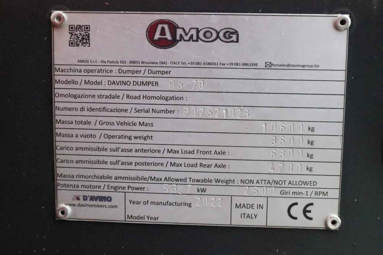 For sale: Davino DS70 Year: 2022 Hours: 127 Weight: 3.600 kg Engine & Transmission: Yanmar 4TNV98C1-NY12 Displacement: 3.319 cc 4-cylinders Power: 52 kW / 70 HP Emission: Stage V Hydrostatic Transmission Max speed: 30 km/h 4x4 drive CE / EPA Capacity: GVW: 10.600 kg Load capacity: 7.000 kg Front axle: 6.800 kg Rear axle: 4.700 kg Specifications: Rotating bucket Camera system LED display LED working light 2x Trailer hitch Rotating beacon Protection bar Tyres: Axle 1: 12.5/80-18 IMP 95% Axle 2: 12.5/80-18 IMP 95% Description: This is a demonstration machine. Low hours, almost new. Ready for work! Of course, we have more pictures and information available, and we are looking forward to helping you. Worldwide delivery is possible! For more information, please contact Office: 0031-527246140 E-mail: info@hulleman.com Web: www.hulleman.com Hulleman Trucks B.V. D.P.A. Weeversstraat 2 8316 GG Marknesse - Holland