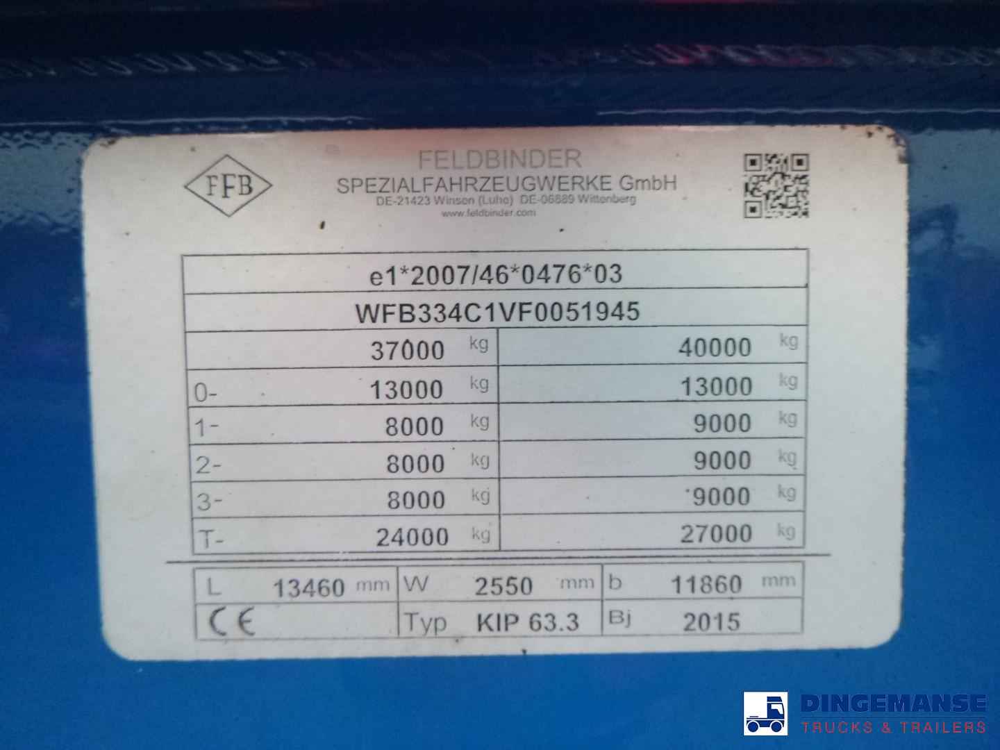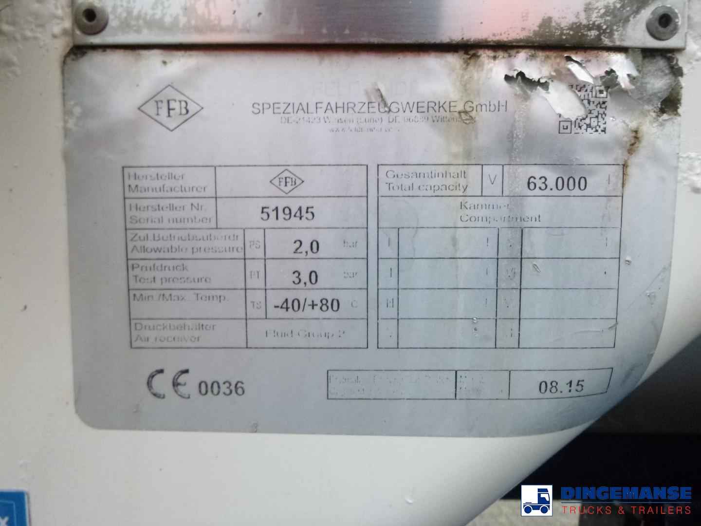 NON DUTY FREE VEHICLE, REQUIRES CUSTOMS CLEARANCE // Aluminium tipping powder/bulk tank, Capacity 63000 liters, 1 Compartment, Year of construction 2015, Test pressure 3.0 bar, Max working pressure 2.0 bar, Air suspension, BPW Eco Plus axles, Drum brakes, ABS, Alloy wheels, Shipment dimensions 1350x250x380 cm