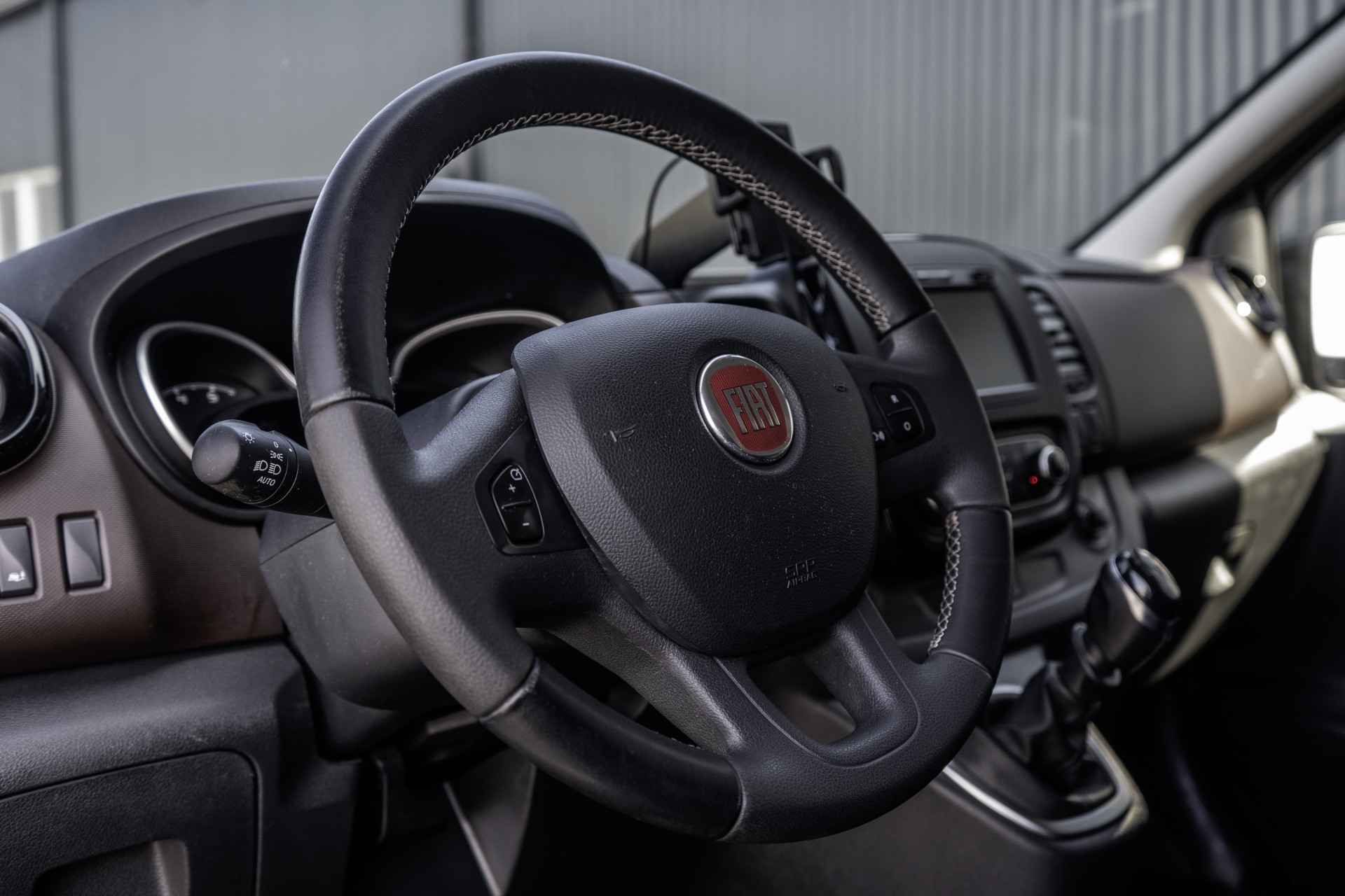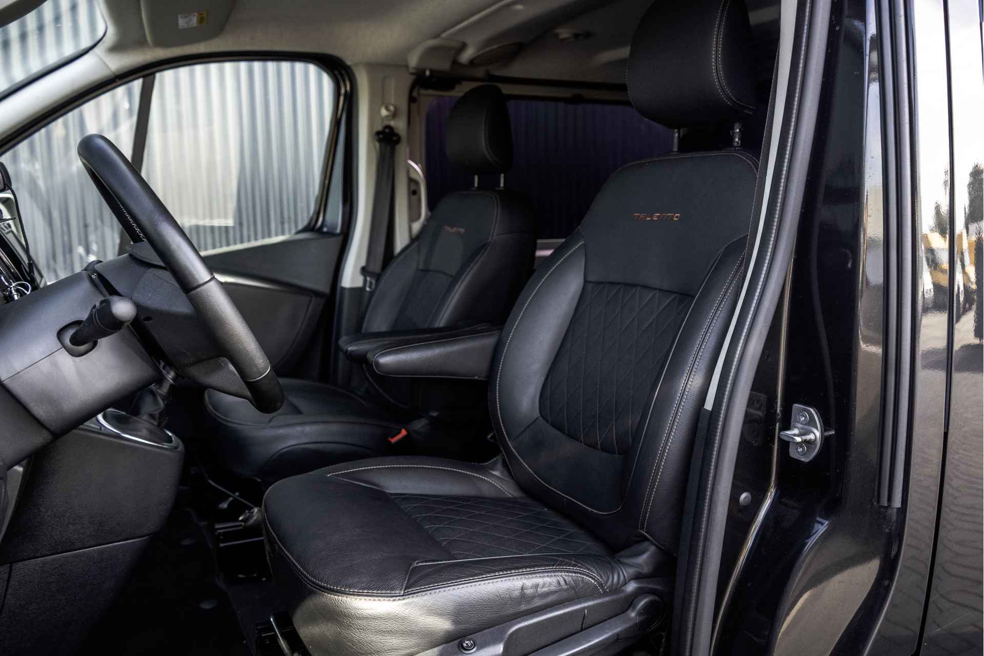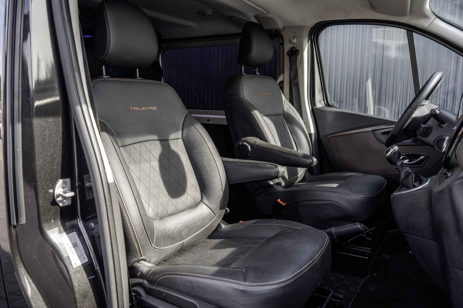 Lease v.a. €365,- per maand. NAP: Logisch. Bandenprofiel: Voor 7,3 mm en Achter 7 mm. Aantal sleutels: 2. Deze Fiat Talento MultiJet Dubbele Cabine is een ruime en comfortabele 5-zits bus, uitgerust met meer dan wat je nodig hebt. Hij beschikt over een achteruitrijcamera, navigatie, parkeersensoren, cruise control en airconditioning, waardoor elke rit een stuk makkelijker en aangenamer wordt. Het interieur straalt luxe uit met lederen stoelen, stuur en pook, stoelverwarming, een multifunctioneel stuur, DAB radio en keyless start. Aan de buitenkant zorgen de in kleur gespoten bumpers en spiegels, sidebars en een spoiler voor een moderne uitstraling. Kortom: een complete, luxe en nette bedrijfswagen die je meteen vertrouwen geeft op de weg.