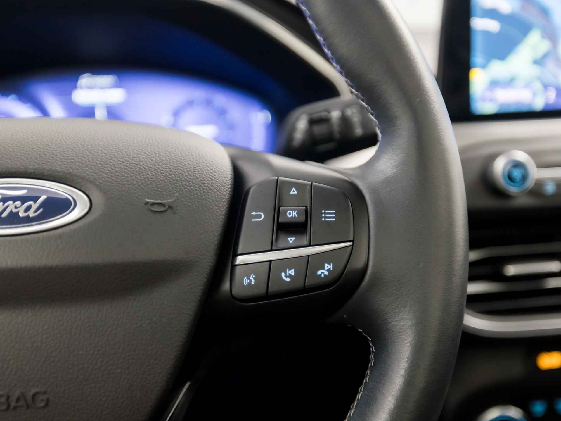 Ongelukken of parkeerschade? Dat gebeurt u niet meer, met de achteruitrijcamera. Pech of storing, altijd vervelend. Maar met Connected Services weet u direct wat eraan scheelt. En dus ook wat er moet gebeuren. Laat u onderweg niet afleiden, de bediening van het audio-installatiesysteem en ook het navigatiesysteem gaat met knoppen op het stuur en met spraak. Natuurlijk is de audio-installatie voorzien van DAB-ontvangst. Smartphone opladen onderweg? Dat gaat supergemakkelijk door de draadloze oplaadmogelijkheid voor telefoons. Aan boord van deze Ford Focus Wagon is een achteropkomend verkeer waarschuwing voor extra veiligheid. Natuurlijk behoren WIFI-hotspot, dual zone automatische airconditioning, regensensor, cruise control, keyless entry en automatisch dimmende binnenspiegel ook tot de uitrusting van deze complete auto.