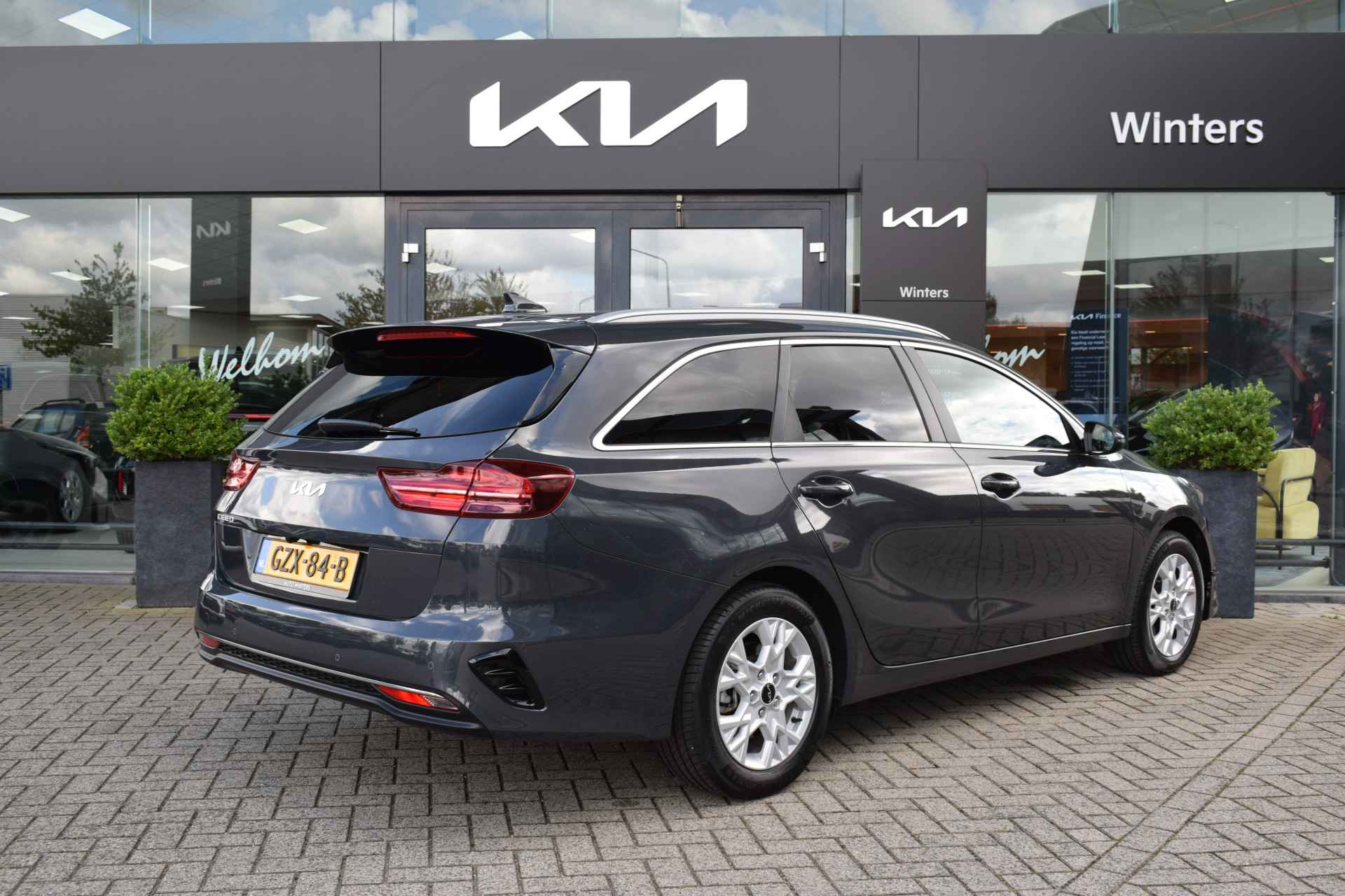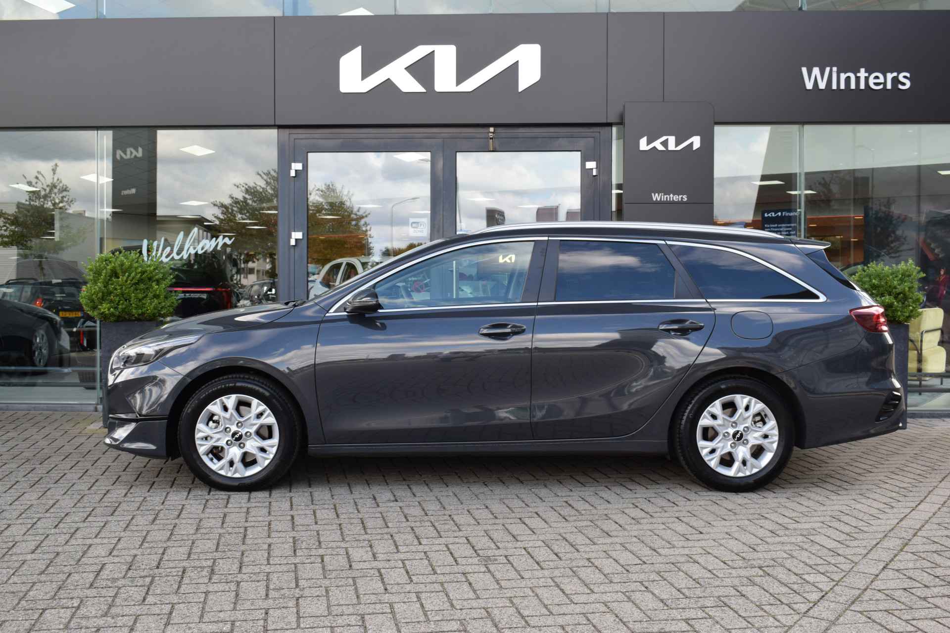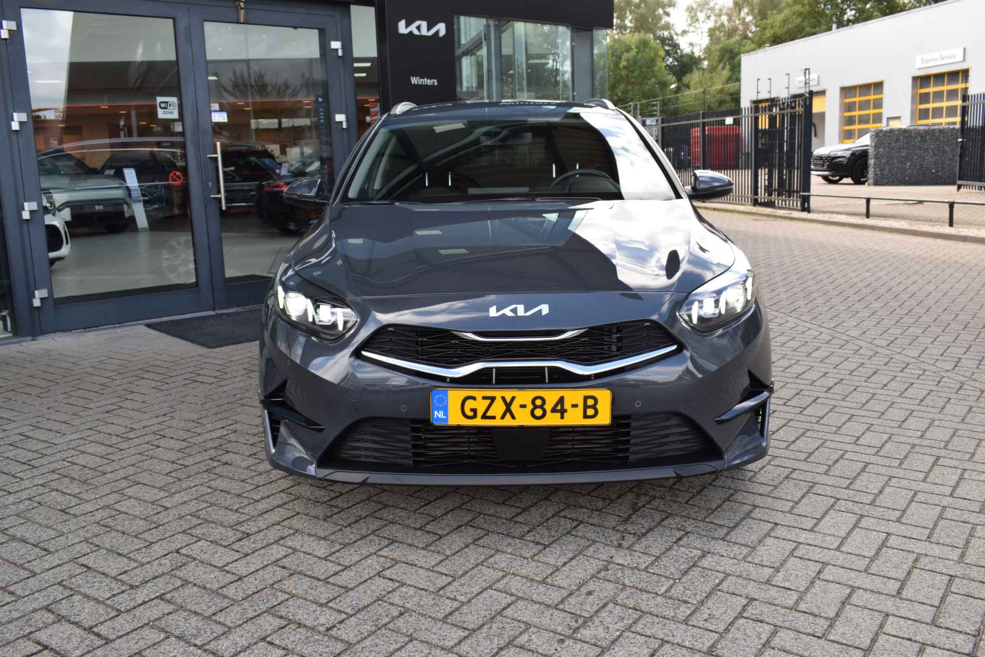 Sportieve en complete Ceed SW 1.5 T-GDi/141pk DynamicPlusLine o.a. met ECC-Airco, Cruise control, Speed Limiter, Navigatie, Achteruitrijcamera, Bluetooth, Armsteunen, Leder/Stof, Stoelverwarming, Stuurverwarming, Electrisch inklapbare buitenspiegels, Electrisch bedienbare Achterklep, Hoogte verstelbare stoelen + stuur, Deels neerklapbare achterbank, Privacy Glas, Keyless Entry met start/stop-button, Rijbaanassistentie, 16" LMV, Parkeersensoren voor + achter, LED verlichting en Tot 10Jr. Kia-Garantie t/m 6-1-2035. Verkoopprijs € 28400,- incl. Basis Service-pakket. Rijklaarprijs € 28995,- incl. FullService-afleverpakket van € 595,-.