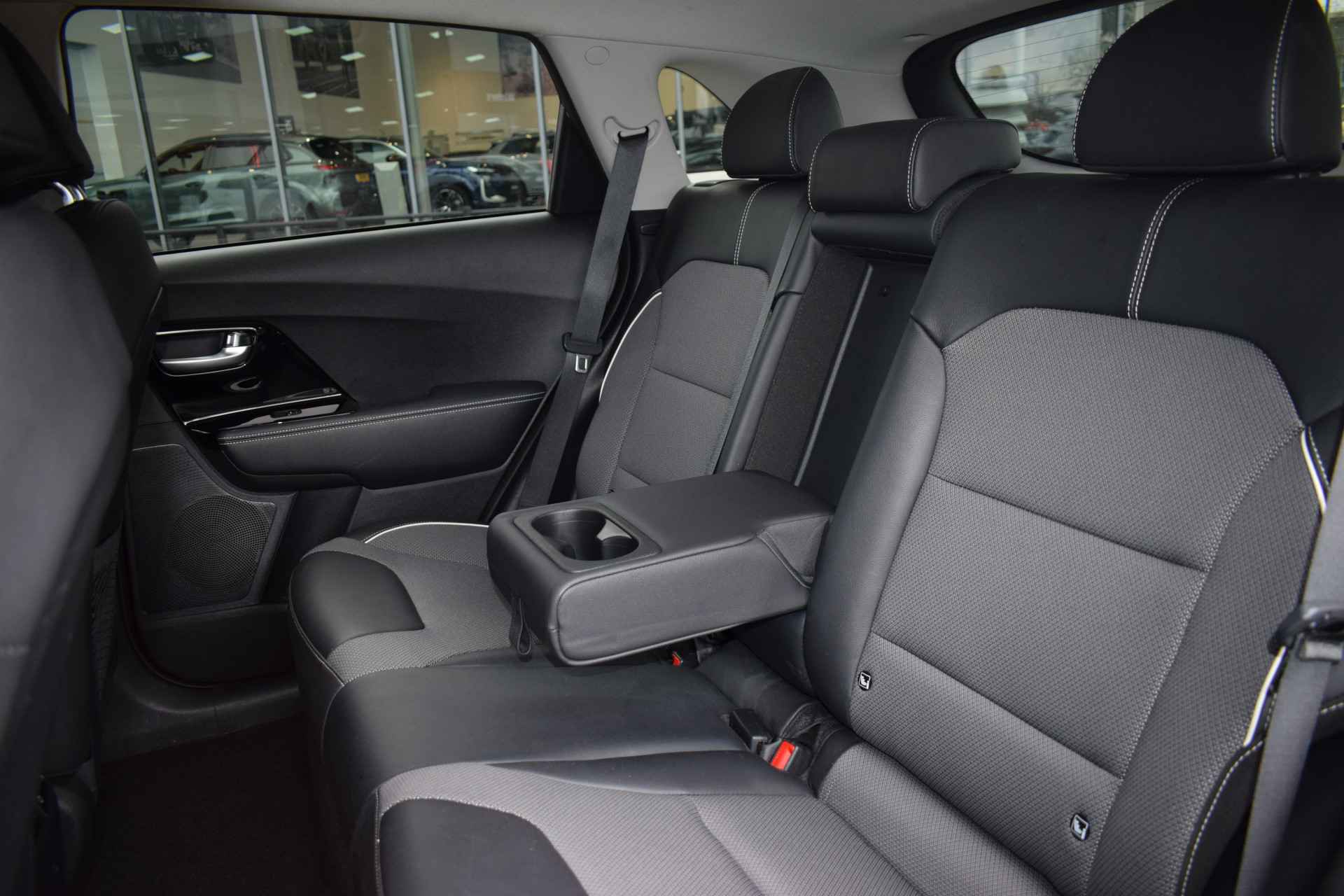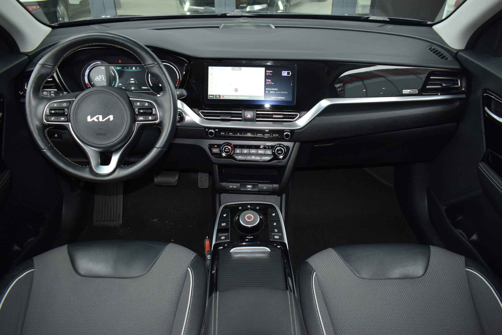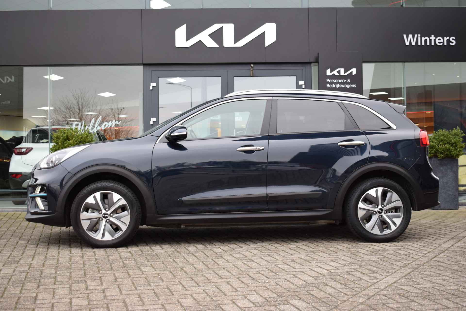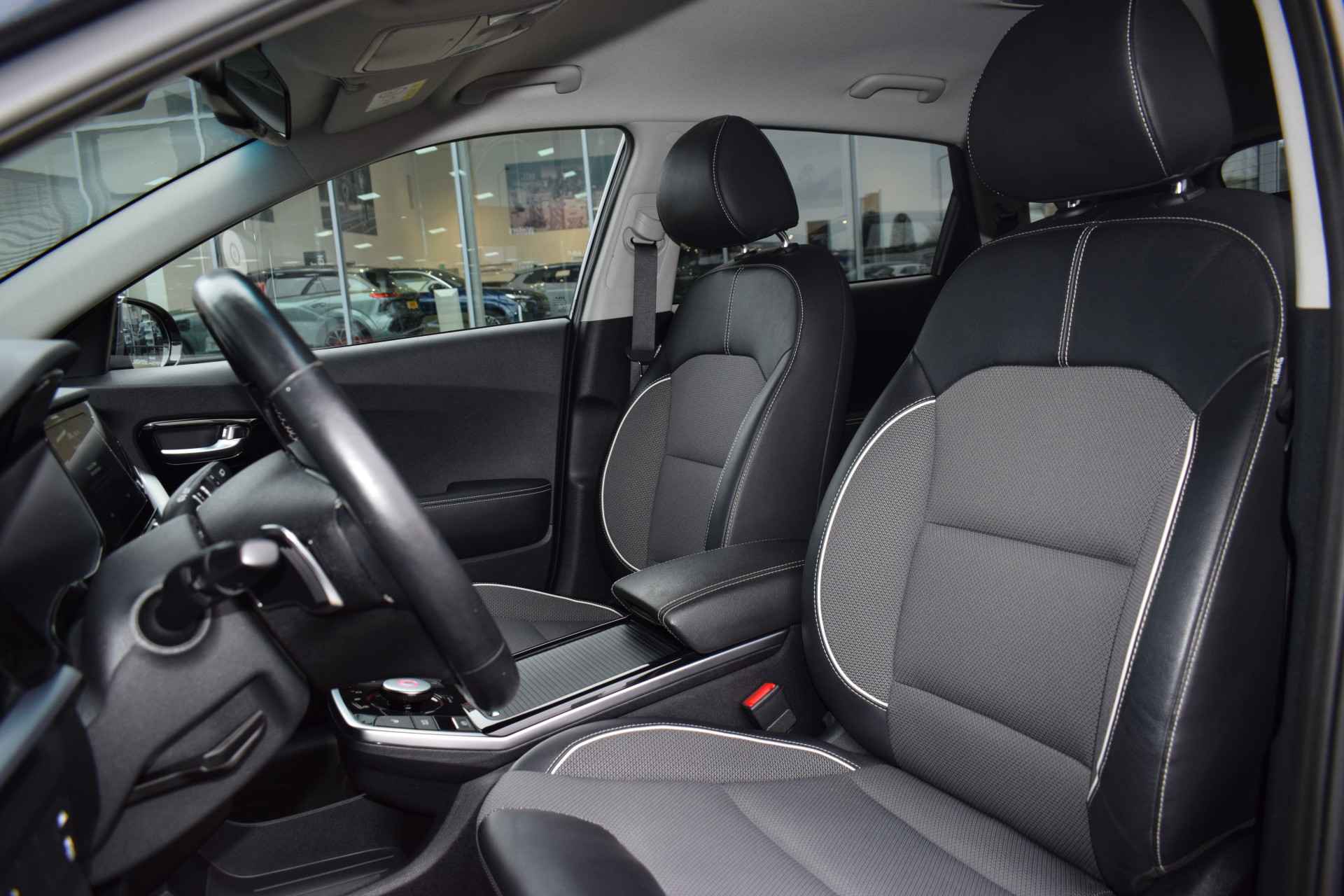 De Kia e-Niro Edition (64 kWh) is een volledig elektrische SUV die comfortabel en rijk uitgerust is voor zijn klasse. De auto heeft 17-inch lichtmetalen velgen, elektrisch inklapbare, verstelbare en verwarmde buitenspiegels, automatische dimlichten, extra getint glas en keyless entry voor gemakkelijk in- en uitstappen. Binnenin biedt hij electronic climate control, een verwarmd stuurwiel en verwarmde voorstoelen, een automatisch dimmende binnenspiegel en een in hoogte verstelbare bestuurdersstoel, samen met elektrisch bedienbare ramen en multifunctioneel stuur. Voor entertainment en navigatie beschikt de e-Niro over een full-map navigatiesysteem, Apple CarPlay en Android Auto, Bluetooth-telefoonvoorbereiding, DAB-radio en spraakbediening. Veiligheid en rijcomfort worden verhoogd door adaptieve cruise control met Stop & Go, parkeersensoren achter, een achteruitrijcamera en diverse assistentiesystemen zoals Autonomous Emergency Braking, rijstrooksensor met correctie, vermoeidheidsherkenning, ABS, ESP en grootlichtassistent. Al met al biedt deze Edition-uitvoering een complete mix van comfort, connectiviteit en moderne rijhulpsystemen.