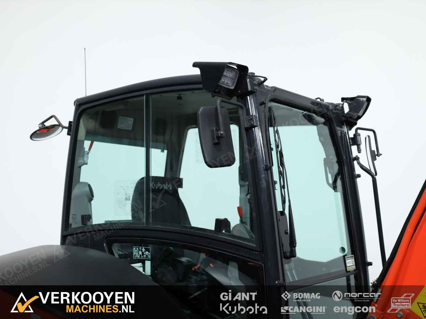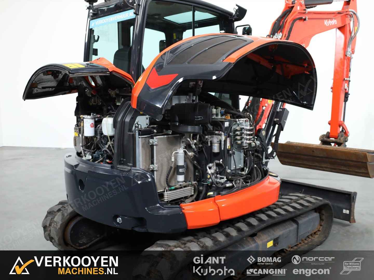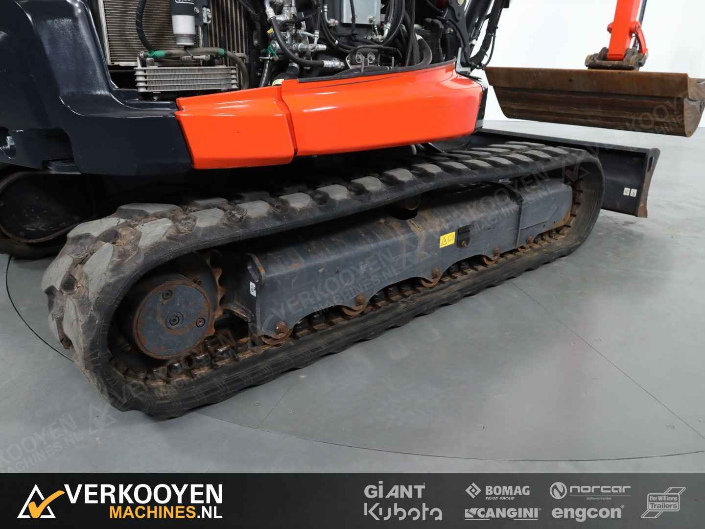 Algemeen Aansluiting: CW10 Status: Gebruikt Opties Standaard voorzien van: Zwaailamp Extra opties: Radio Rijwerk Breedte: 196 cm Conditie rijwerk: 90 % Standaard bieden we deze machine aan met een hydraulische CW10 snelwissel en een set bakken. Eventueel leverbaar met vaste of afneembare Engcon draaikantelstuk. De Kubota KX060-5 is de eerste -5 serie conventionele graafmachine. Deze 5635 kg. wegende machine is de sterkste in zijn klasse. Ontwikkeld met de machinist in gedachte en dus voorzien van een zeer ruimer cabine, luchtgeveerde stoel, verbeterde isolatie, perfect zicht rondom en allerlei nieuwe functies die het werk nog comfortabeler maken. Deze graafmachine heeft een uitstekende stabiliteit en is perfect voor gebruik met verschillende aanbouwdelen. Hij is standaard uitgerust 2 extra functies met een nauwkeurige controle op de olietoevoer. Deze KX060-5 is sterk, comfortabel en zeer compleet.