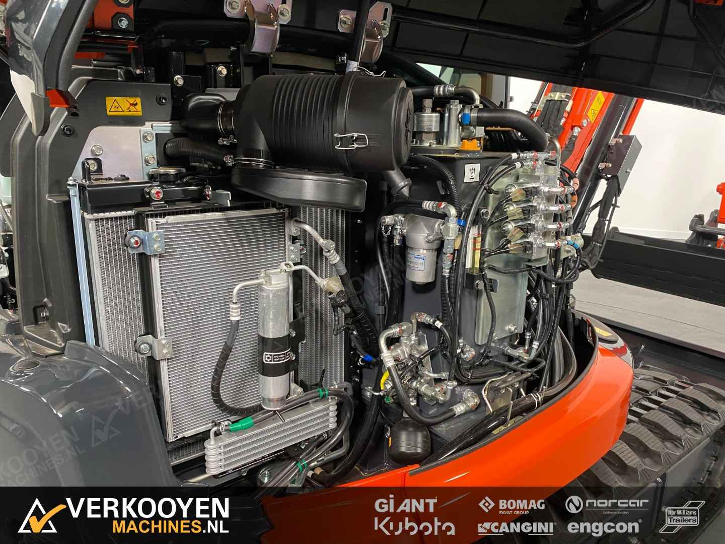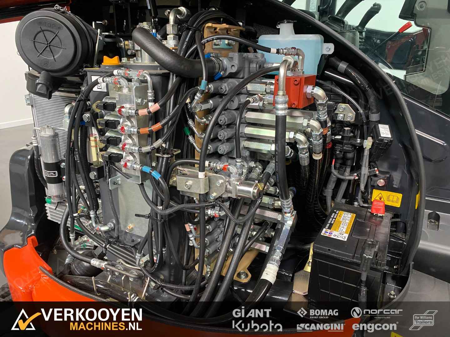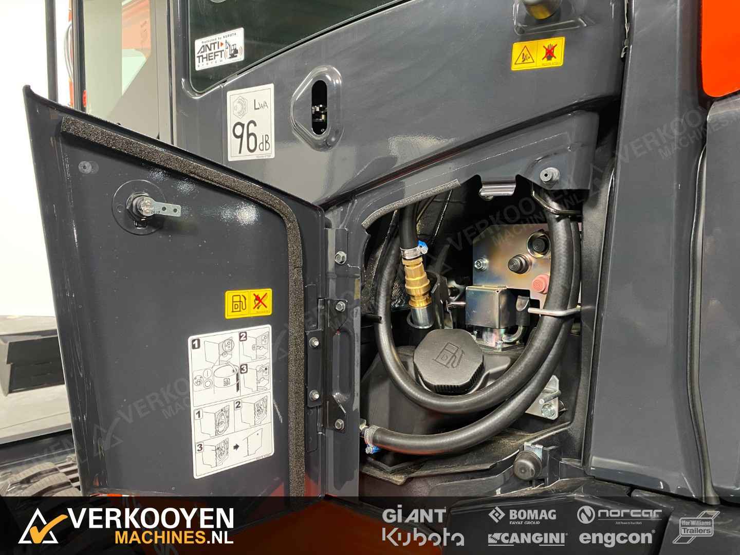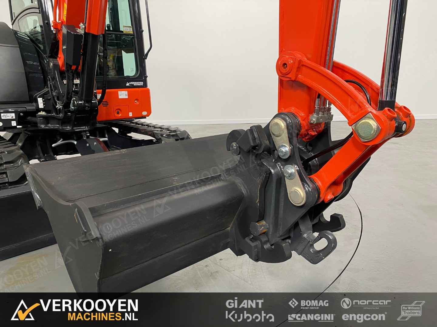 Algemeen Aansluiting: CW10 Status: Gebruikt Opties Standaard voorzien van: Zwaailamp Extra opties: Radio Rijwerk Breedte: 196 cm Conditie rijwerk: 90 % Standaard bieden we deze machine aan met een hydraulische CW10 snelwissel en een set bakken. Eventueel leverbaar met vaste of afneembare Engcon draaikantelstuk. De Kubota KX060-5 is de eerste -5 serie conventionele graafmachine. Deze 5635 kg. wegende machine is de sterkste in zijn klasse. Ontwikkeld met de machinist in gedachte en dus voorzien van een zeer ruimer cabine, luchtgeveerde stoel, verbeterde isolatie, perfect zicht rondom en allerlei nieuwe functies die het werk nog comfortabeler maken. Deze graafmachine heeft een uitstekende stabiliteit en is perfect voor gebruik met verschillende aanbouwdelen. Hij is standaard uitgerust 2 extra functies met een nauwkeurige controle op de olietoevoer. Deze KX060-5 is sterk, comfortabel en zeer compleet.