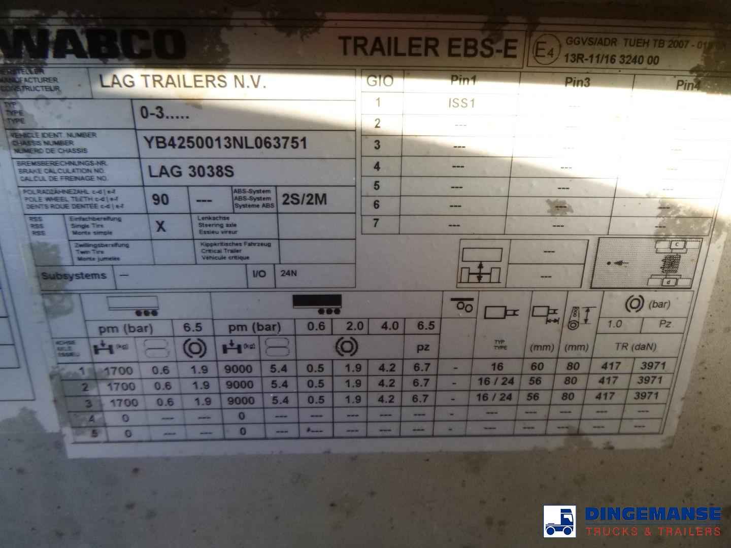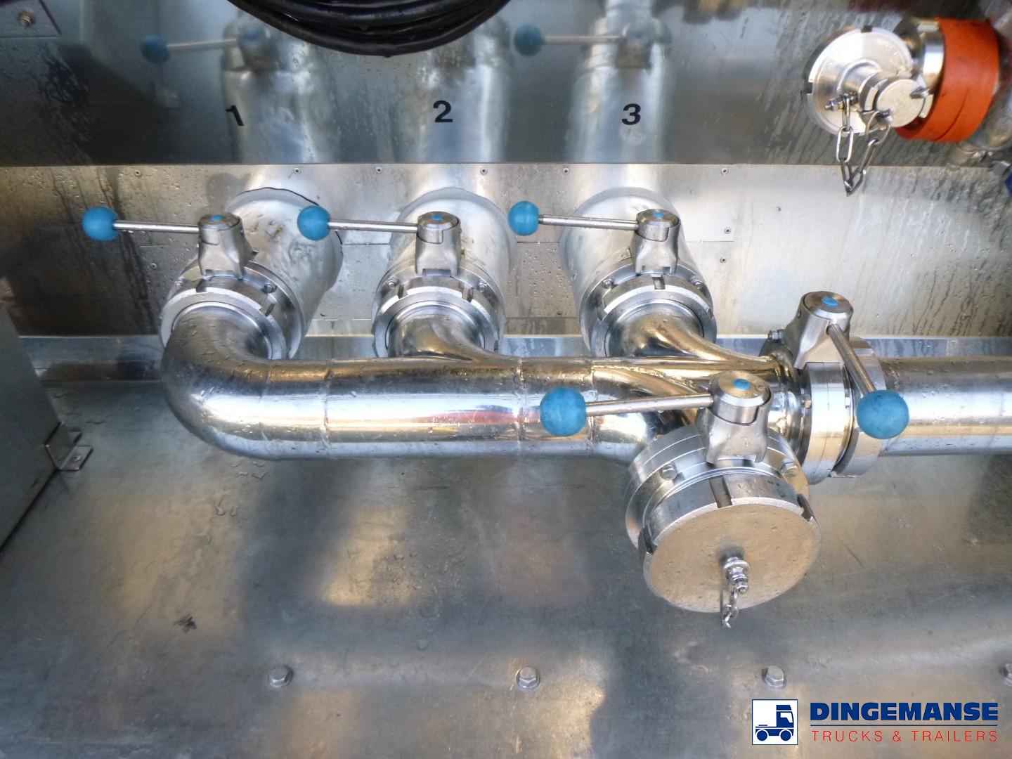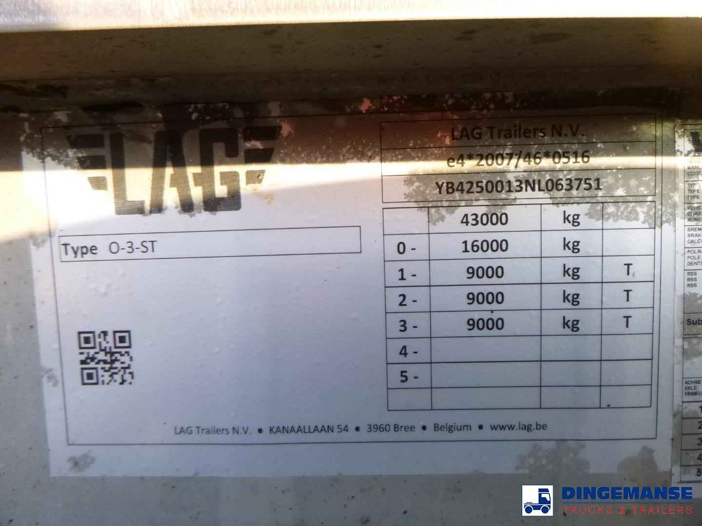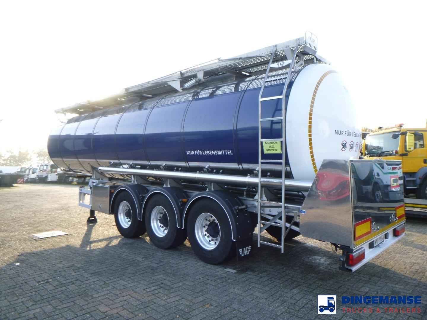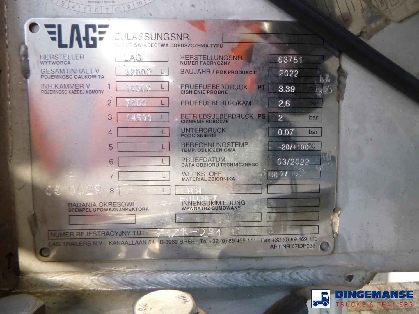 L.A.G. insulated Food tank (inox) 32000 liters, 3 Compartments (10500;7000;14500), Insulated stainless steel, Test pressure 3.39 bar, Max working pressure 2.0 bar, Pump, Steam Heating and WEBASTO (liquid heating), Diesel generator for independent heating, Year of construction 2022, Air suspension, BPW axles, Disc brakes, ABS, Alloy wheels, Shipment dimensions 1160x250x370 cm