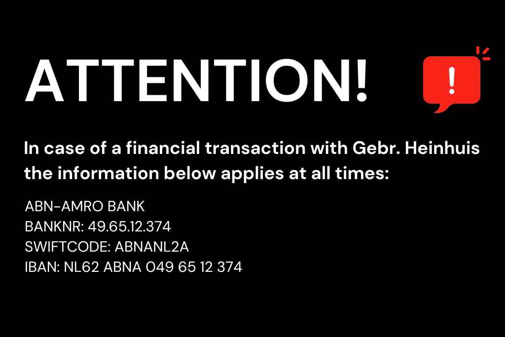 The General Terms and Conditions of Heinhuis are applicable to all adverts, offers and quotations by Heinhuis, all agreements entered into by Heinhuis and the negotiations preceding them. By any form of response you accept the applicability of the General Terms and Conditions of Heinhuis and you declare that you have taken note of these General Terms and Conditions. Our prices are export netto prices.