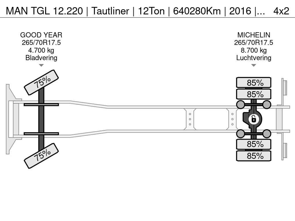 MAN TGL 12.220 | Tautliner | 12Ton | 640280Km | 2016 | Dhollandia 1500 kg | Smart Tacho 2 | 2 Tanks | Slaapcabine | Stand klimaatregeling | Gereedschapskist | Cruise Control | Automatische versnellingsbak | Euro6 | 4X2 | Franse vrachtwagen