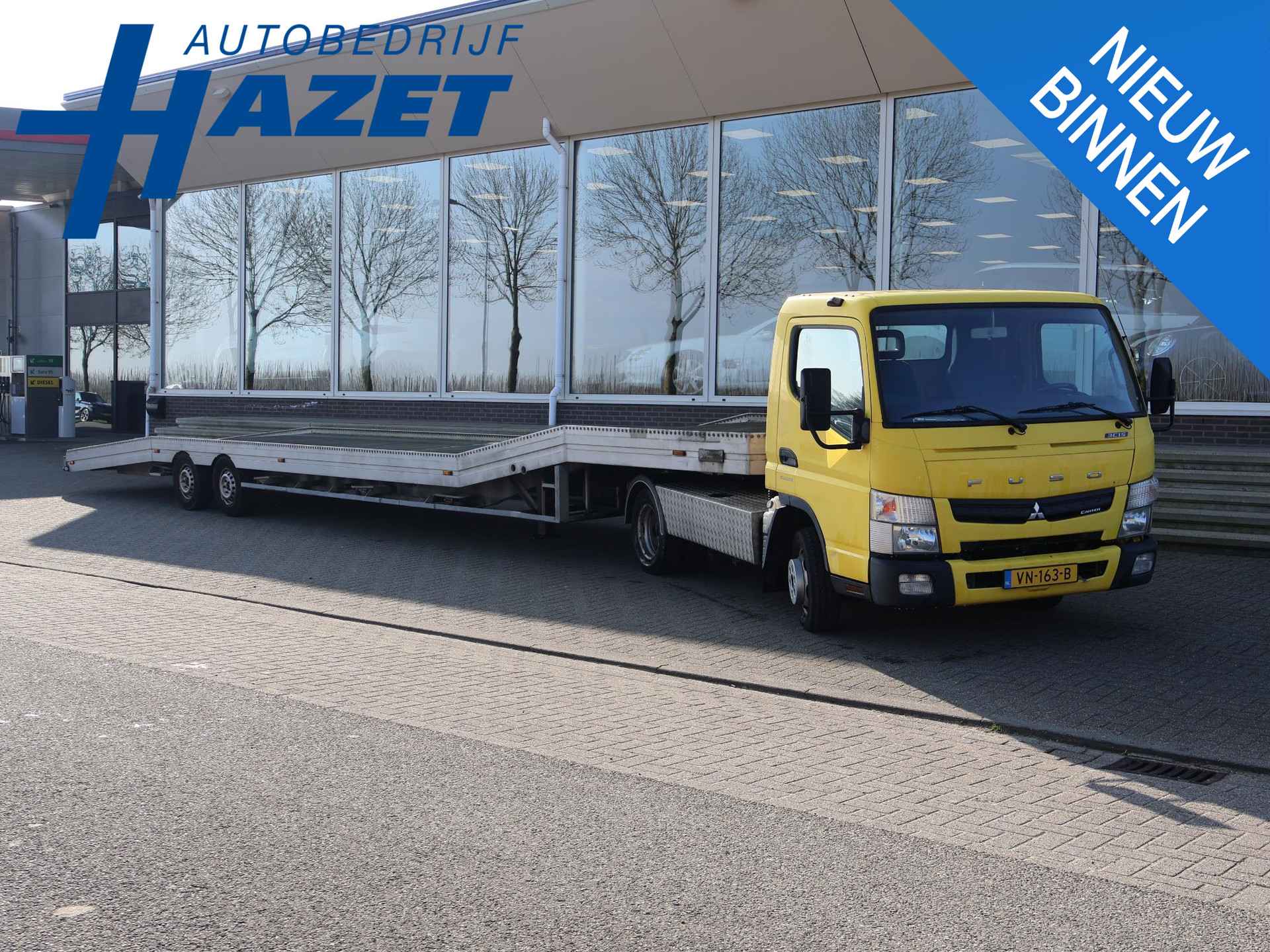 2015 Mitsubishi Canter trekker / chassis cabine 3.0D 150 PK diesel automaat met 177.450 km in combinatie met een Veldhuizen oplegger autotransport trailer voor 3 auto's, met kenteken OH-85-YH, een Veldhuizen P 33-4 oplegger uit 05-2005 met 3690 kg laadvermogen. Lengte oplegger 12,80 meter. Afstand hart koppeling tot achterzijde 11,74 meter. Breedte 2,15 meter, Constructiesnelheid oplegger op kenteken is 100 km/h. Lier met afstandsbediening, De Canter trekker is voorzien van 3 zitplaatsen, Prijs is voor de combinatie en exclusief BTW.