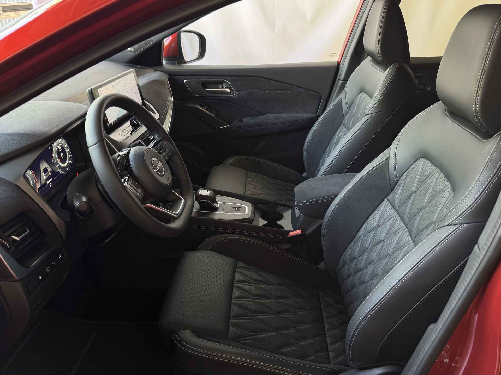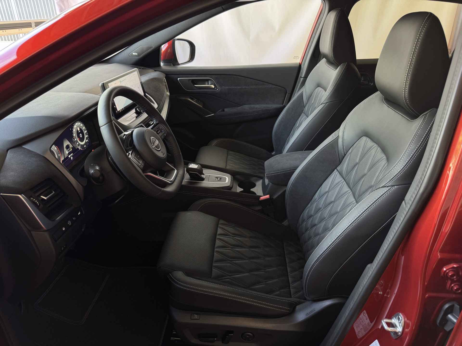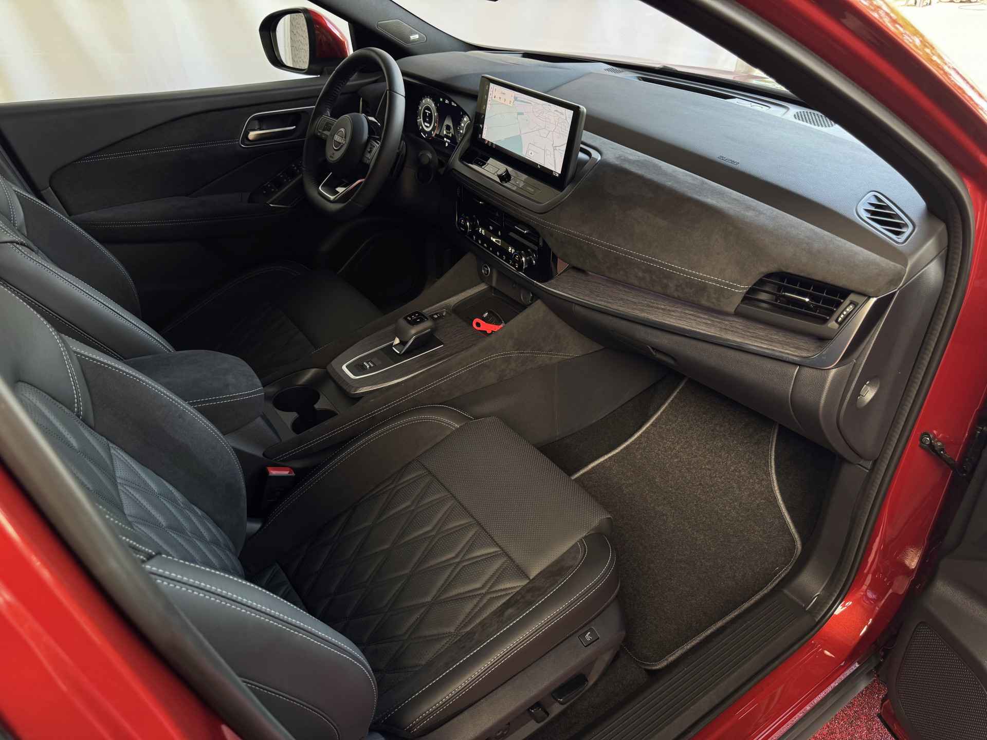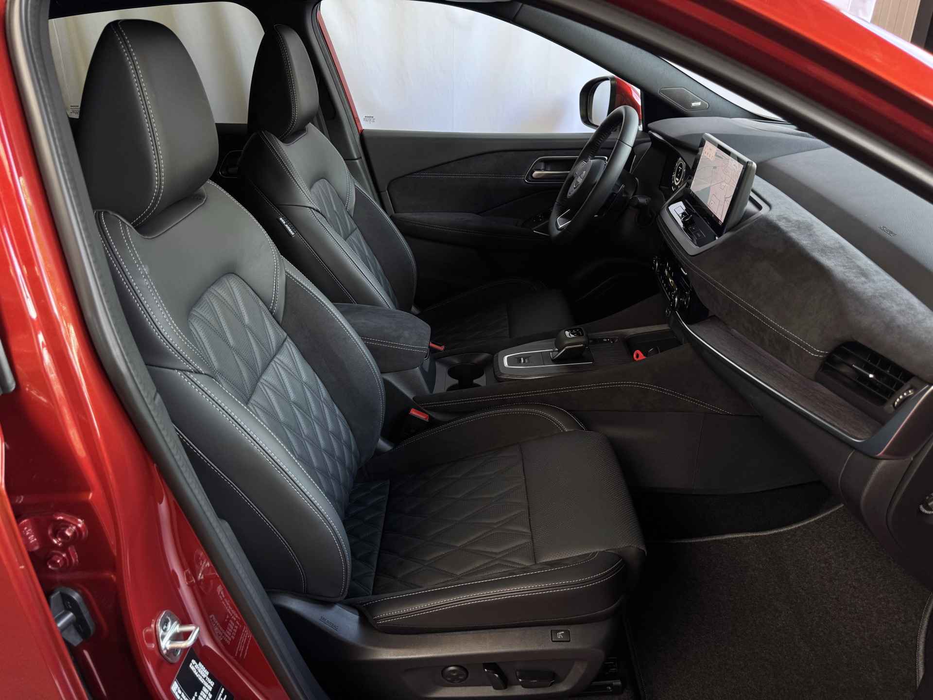 Het interieur van de Qashqai TEKNA+ is ontworpen met oog voor detail en hoogwaardige materialen. De luxe lederen bekleding, verwarmde voorstoelen en elektrisch verstelbare stoelen met geheugenfunctie zorgen voor optimaal comfort. Het ruime en ergonomische ontwerp van de cabine biedt een premium rijervaring, terwijl het panoramische dak zorgt voor een open en lichte ambiance.