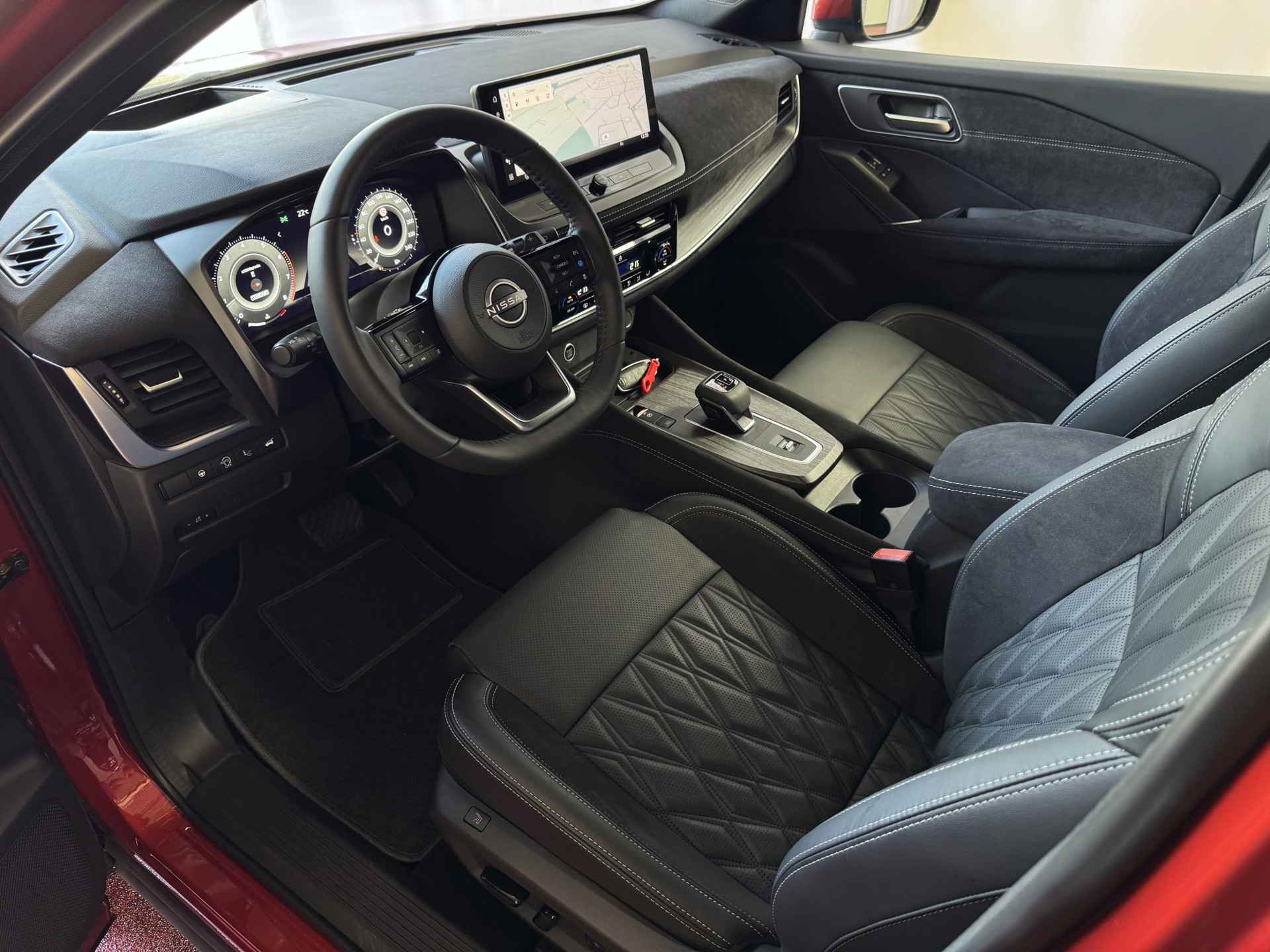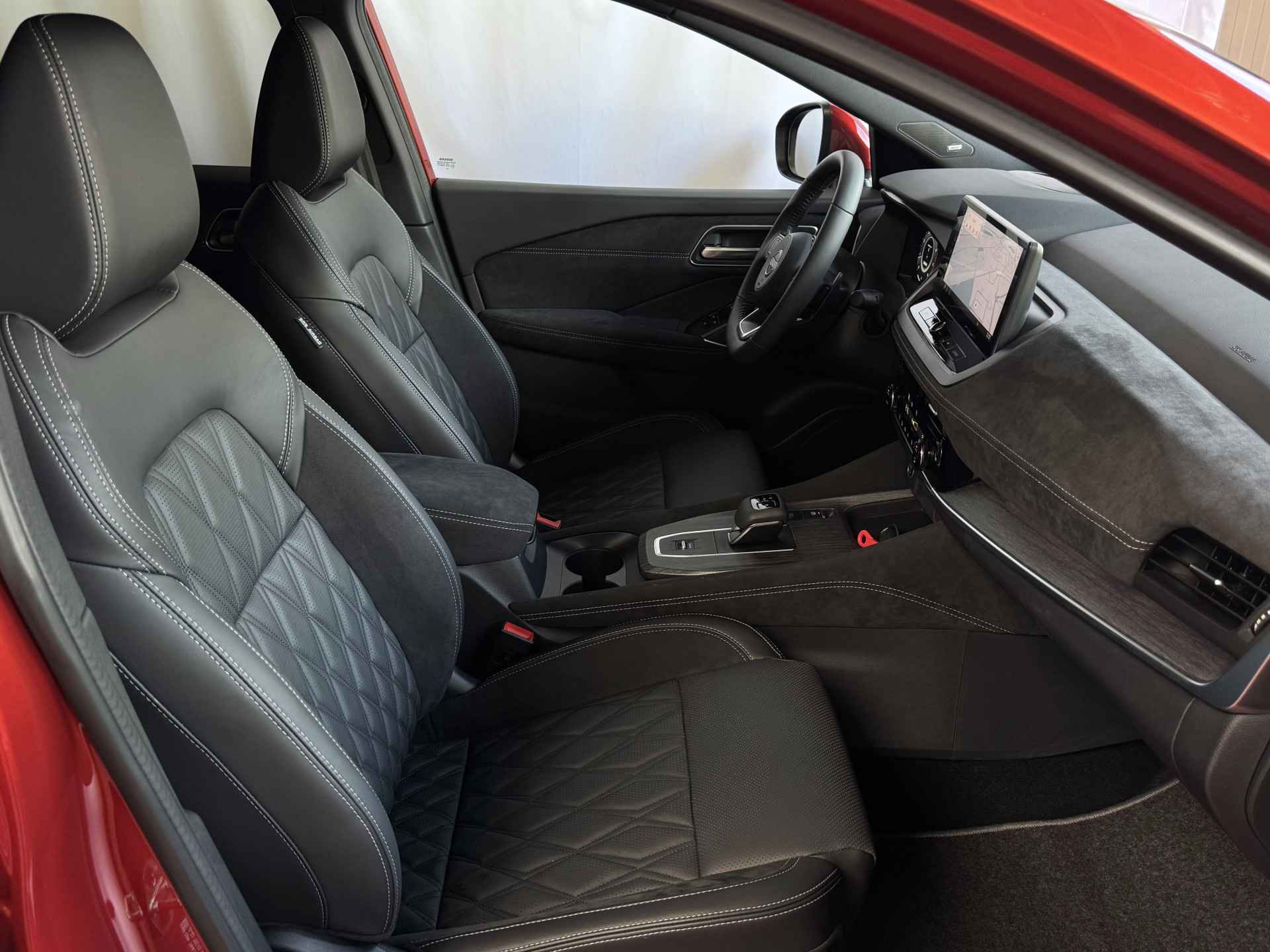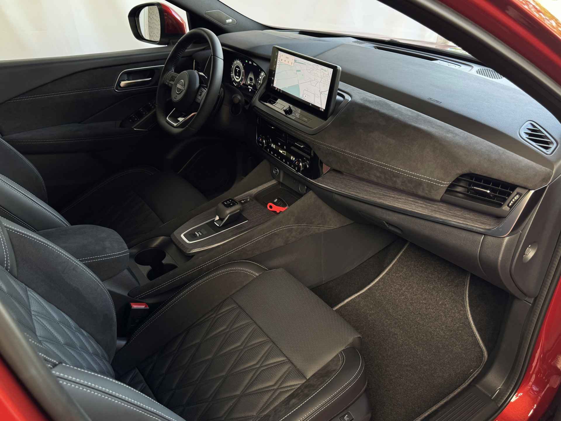 Het interieur van de Qashqai TEKNA+ is ontworpen met oog voor detail en hoogwaardige materialen. De luxe lederen bekleding, verwarmde voorstoelen en elektrisch verstelbare stoelen met geheugenfunctie zorgen voor optimaal comfort. Het ruime en ergonomische ontwerp van de cabine biedt een premium rijervaring, terwijl het panoramische dak zorgt voor een open en lichte ambiance.