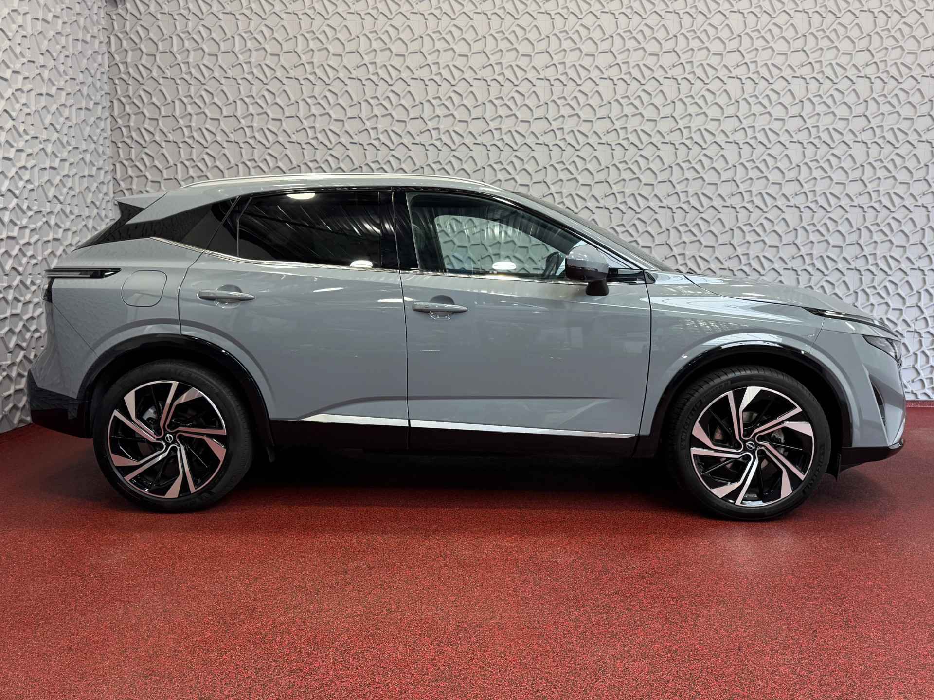 Het exterieur van de Qashqai TEKNA+ straalt verfijning en sportiviteit uit. De kenmerkende V-Motion grille, in combinatie met de strakke lijnen en 20-inch lichtmetalen velgen, zorgt voor een krachtige uitstraling. De innovatieve matrix LED-koplampen en LED-achterlichten verhogen niet alleen de veiligheid, maar dragen ook bij aan de moderne en premium look van deze SUV. Het panoramische dak biedt extra lichtinval en een ruimtelijk gevoel, perfect voor een luxueuze rijervaring.