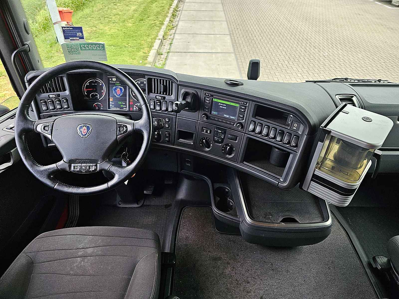 Aantal Assen: 3, Configuratie: 6x2, Dubbele banden, Eigen gewicht: 10660 kg, Totaalgewicht: 27000 kg, Diesel inhoud totaal: 400 liter, Aanhangwagen kopp., Dikte koppelingspen: Special, Schotel type: Fixed, Aantal sperren: 1, Vering type: vollucht, Soort cabine: Highline, Cruise control, Tachograaf, Digitale tachograaf, Airconditioning, Standkachel, Elektrische ramen, Elektrische spiegels, Radio/cassette, Kleur: Meerkleurig, Verwarmde spiegels, Soort lampen: Halogeen, Snelheidsbegrenzing, Laneassist, Climatecontrol, Stoelverwarming, Bluetooth, Motorvermogen: 331 Kw (444 Hp), Brandstof: diesel, Euro: 6, Soort versnellingsbak: Opti-cruise, Merk versnellingsbak: Scania, Snelheidsbegrenzing, Versnellingen: 12, Extra remsysteem, Merk retarder: Scania, Stuurbekrachtiging, ABS (Anti Blokkeer Systeem), ASR (Anti Slip Regeling), Start accu, Centrale vergrendeling, Stoelopstelling: 1+1, Stoelbekleding: stof, Stoel verstelling: Handmatig, Laadklep, Soort laadklep: achtersluit klep, Capaciteit laadklep: 2500 kg, Merk laadklep: Dhollandia, Materiaal laadklep: staal, Plateau grootte: 200 x 255, CROWN EDITION / GRS905R / RETARDER / TAILLIFT / BDF + BOX COMBI