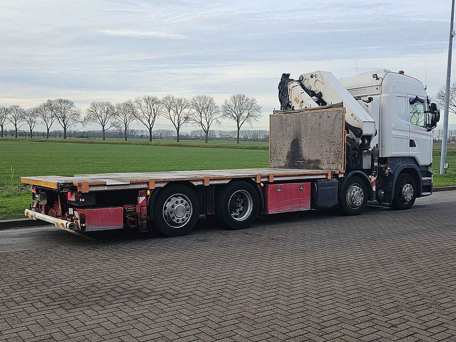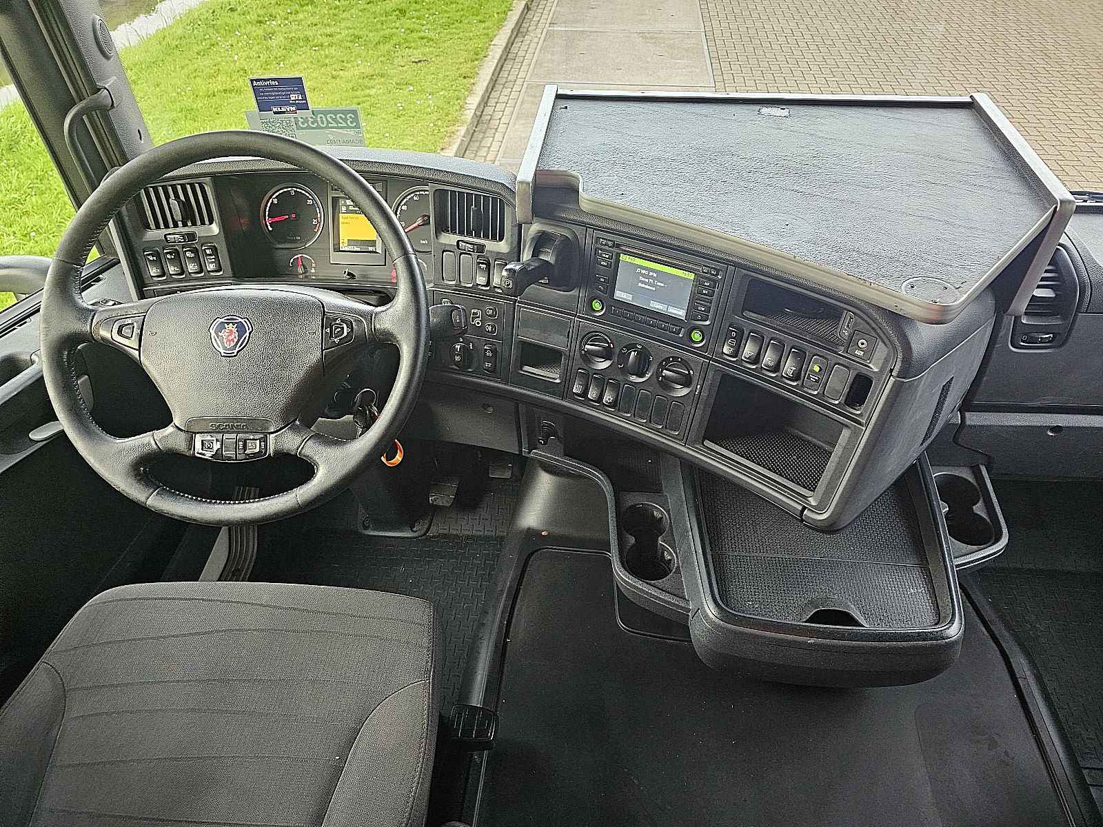 Aantal Assen: 4, Configuratie: 8x2, Eigen gewicht: 18740 kg, Totaalgewicht: 35000 kg, Diesel inhoud totaal: 400 liter, Aanhangwagen kopp., Dikte koppelingspen: 40 DIN, Schotel type: Fixed, Aantal sperren: 1, Centrale smering, Vering type: luchtvering, Soort cabine: slaapcabine, Cruise control, Tachograaf, Digitale tachograaf, Airconditioning, Standkachel, Elektrische ramen, Elektrische spiegels, Radio/cassette, GPS navigatie, Kleur: Wit, Verwarmde spiegels, Soort lampen: Halogeen, Stoelverwarming, Bluetooth, Zwaailichten, Motorvermogen: 360 Kw (483 Hp), Brandstof: diesel, Euro: 6, Soort versnellingsbak: Opti-cruise, Merk versnellingsbak: Scania, Versnellingen: 12, Extra remsysteem, Merk retarder: Scania, Stuurbekrachtiging, ABS (Anti Blokkeer Systeem), ASR (Anti Slip Regeling), PTO, PTO soort: 1, Start accu, Twistlocks: 1x20, Pomp, Centrale vergrendeling, Stoelopstelling: 1+1, Stoelbekleding: stof, Stoel verstelling: Handmatig, Kraan, Kraan merk: HMF 6020, Bouwjaar kraan: 2015, Capaciteit kraan: 60000, Max. belasting: ?, Aantal steunpoten: 4, Positie kraan: achter de cabine, Hydr. uitschuifbaar: 6 keer, Lasthaak