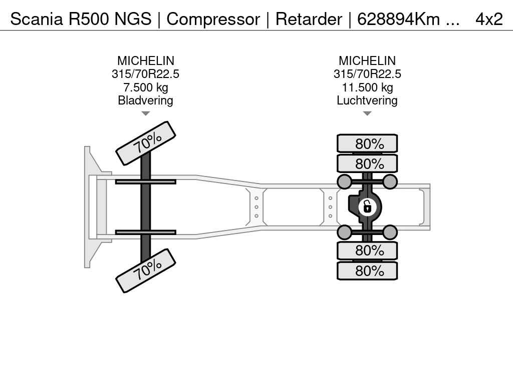 SCANIA R500 NGS | Compressor | Retarder | 628894Km | 2021 | Smart Tacho 2 | Alcoas | Bandenspanning | Centrale smering | Stand Klima | Park Airco | Stoel Verwarming/Koeling | Koelkast | Airconditioning | Cruise Control | Automatische versnellingsbak | Euro6-D | 4X2 | TÜV/APK/APK 05-2026 | Duitse Trekker