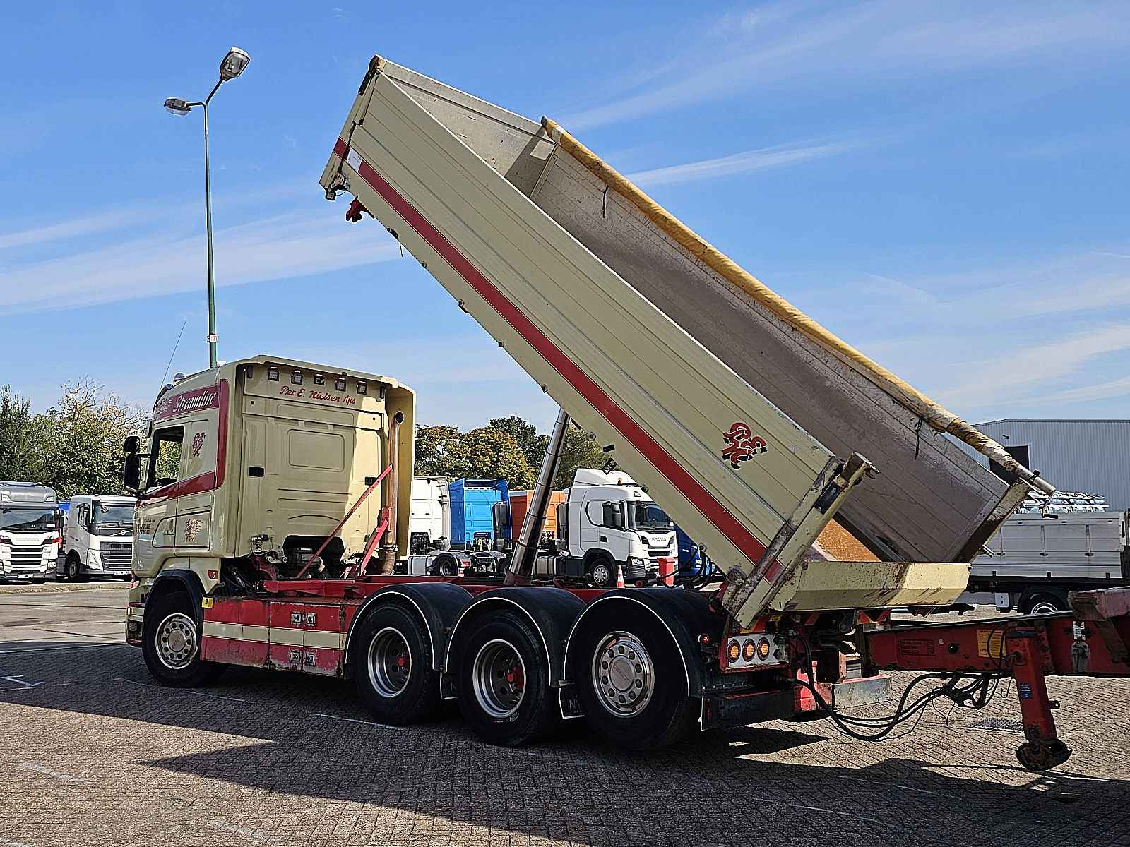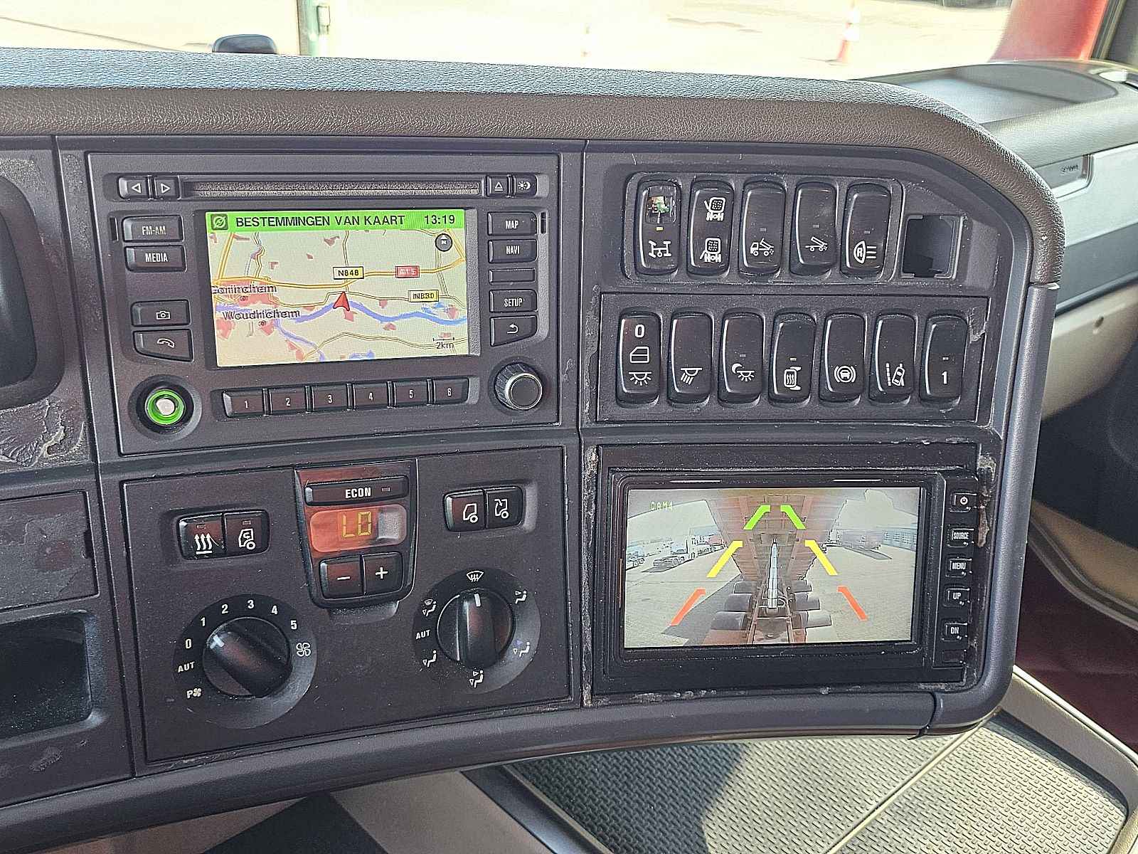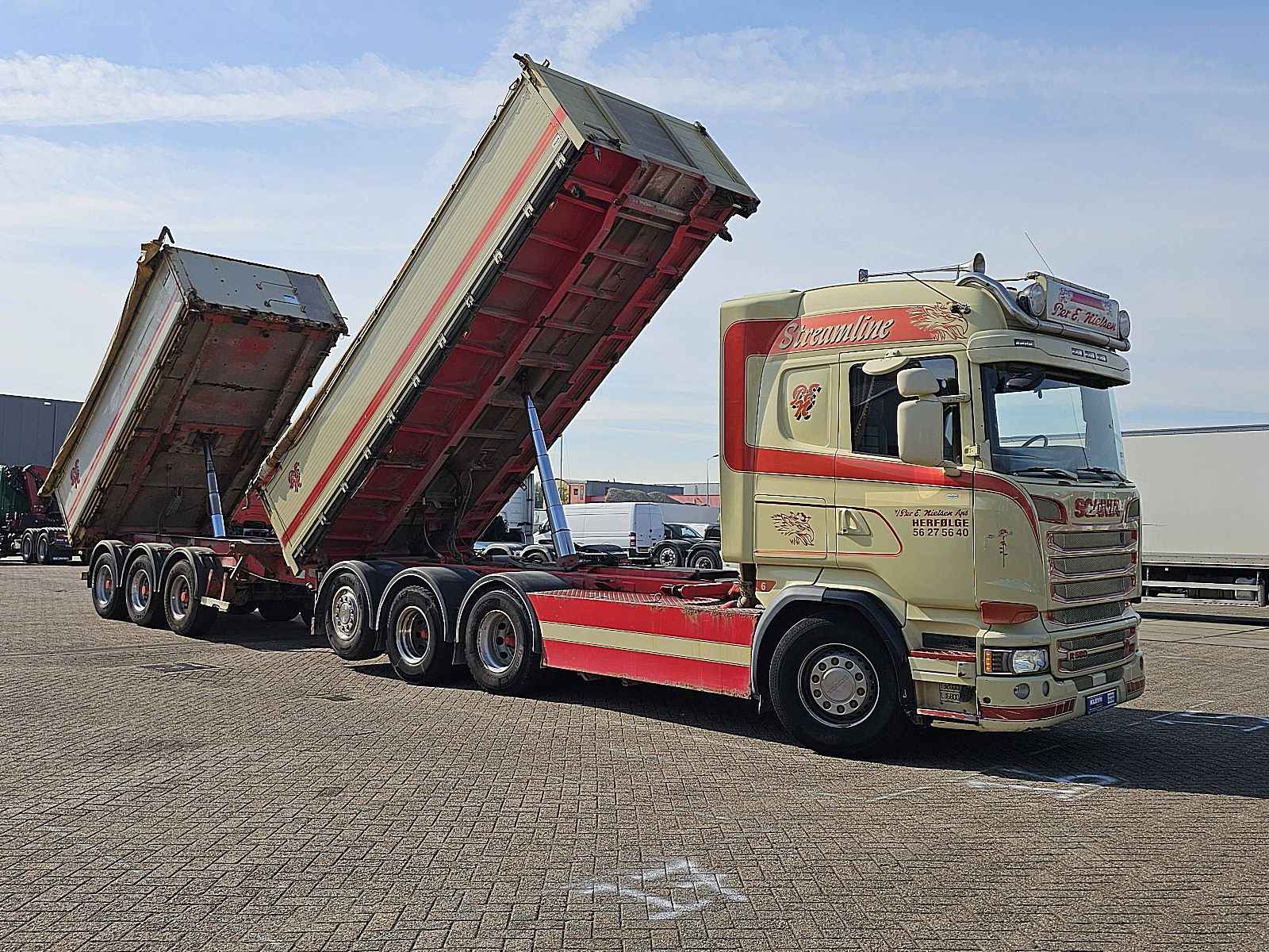 Aantal Assen: 4, Configuratie: 8x4, Eigen gewicht: 15675 kg, Totaalgewicht: 33000 kg, Diesel inhoud totaal: 400 liter, Aanhangwagen kopp., Dikte koppelingspen: Special, Schotel type: Fixed, Aantal sperren: 2, Vering type: vollucht, Soort cabine: Highline, Cruise control, Tachograaf, Digitale tachograaf, Airconditioning, Standkachel, Elektrische ramen, Elektrische spiegels, Radio/cassette, GPS navigatie, Kleur: Meerkleurig, Verwarmde spiegels, Achteruitrij camera, Soort lampen: Halogeen, Laneassist, Climatecontrol, Stoelverwarming, Bluetooth, Zwaailichten, Motorvermogen: 427 Kw (573 Hp), Brandstof: diesel, Euro: 6, Soort versnellingsbak: Opti-cruise, Merk versnellingsbak: Scania, Versnellingen: 12, Stuurbekrachtiging, ABS (Anti Blokkeer Systeem), ASR (Anti Slip Regeling), Hydraulische installatie, PTO, PTO soort: 1, Start accu, Aantal zijden: 2 zijdig kippend, systeemtype: ., Pomp, Centrale vergrendeling, Stoelopstelling: 1+1, Stoelbekleding: leder, Stoel verstelling: Handmatig