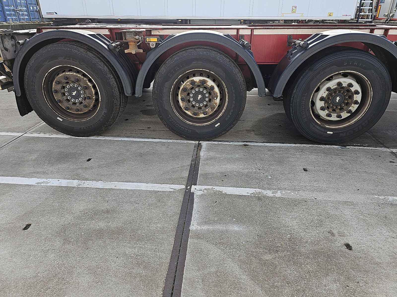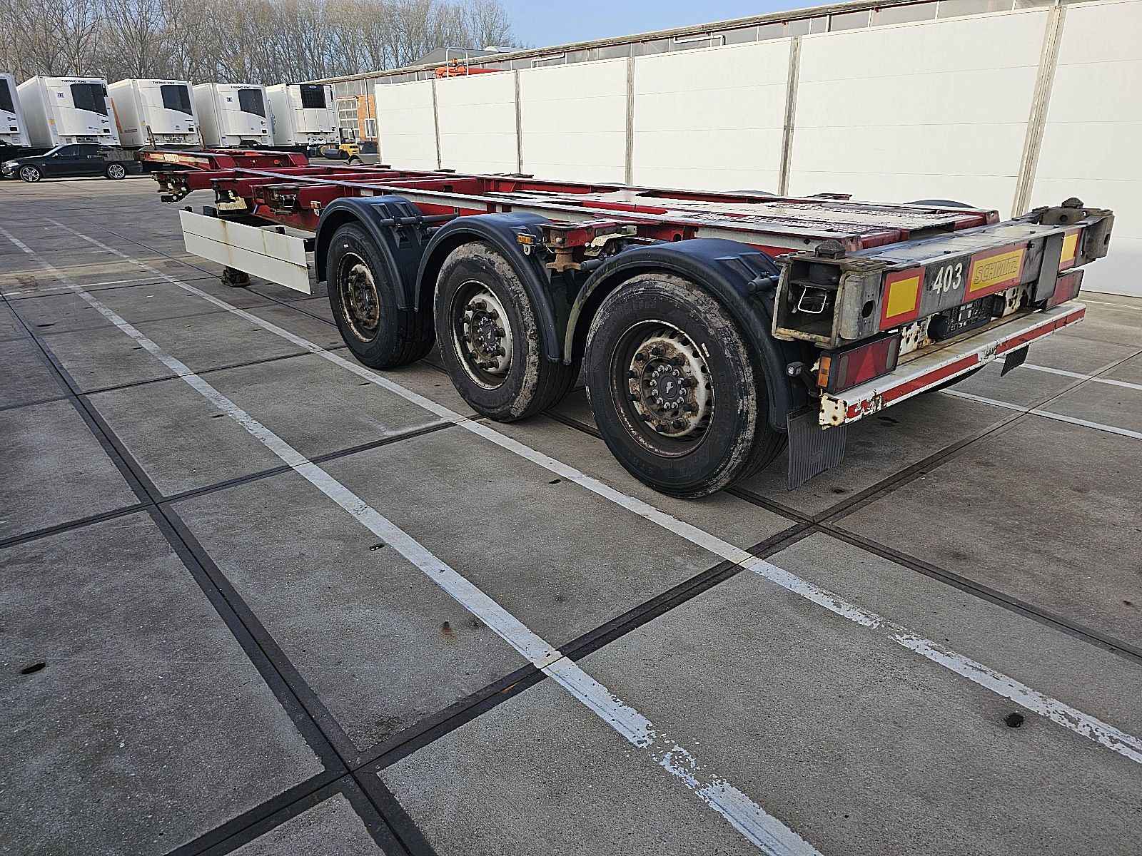 Aantal Assen: 3, Eigen gewicht: 5600 kg, Totaalgewicht: 39000 kg, Soort chassis: Volledig chassis, Materiaal chassis: staal, Kingpin afmeting: 2 inch, Vering type: vollucht, ABS (Anti Blokkeer Systeem), EBS, Bouwjaar opbouw: 2012, Twistlocks: 2x20 + 1x30 + 1x40 + 1x45 high cube, Uitschuifbare chassis: Voorkant / achter, Merk as: SCHMITZ