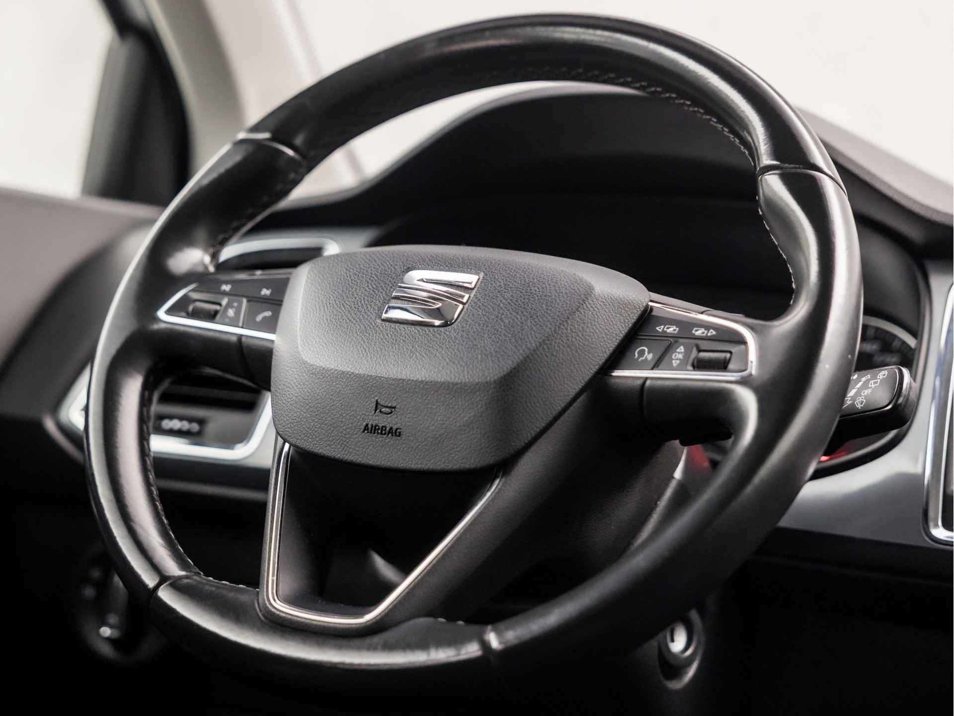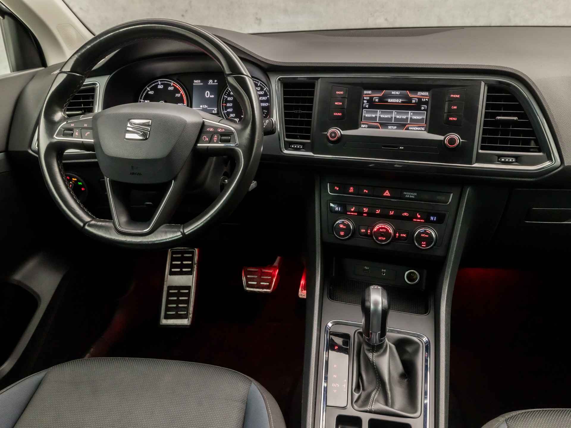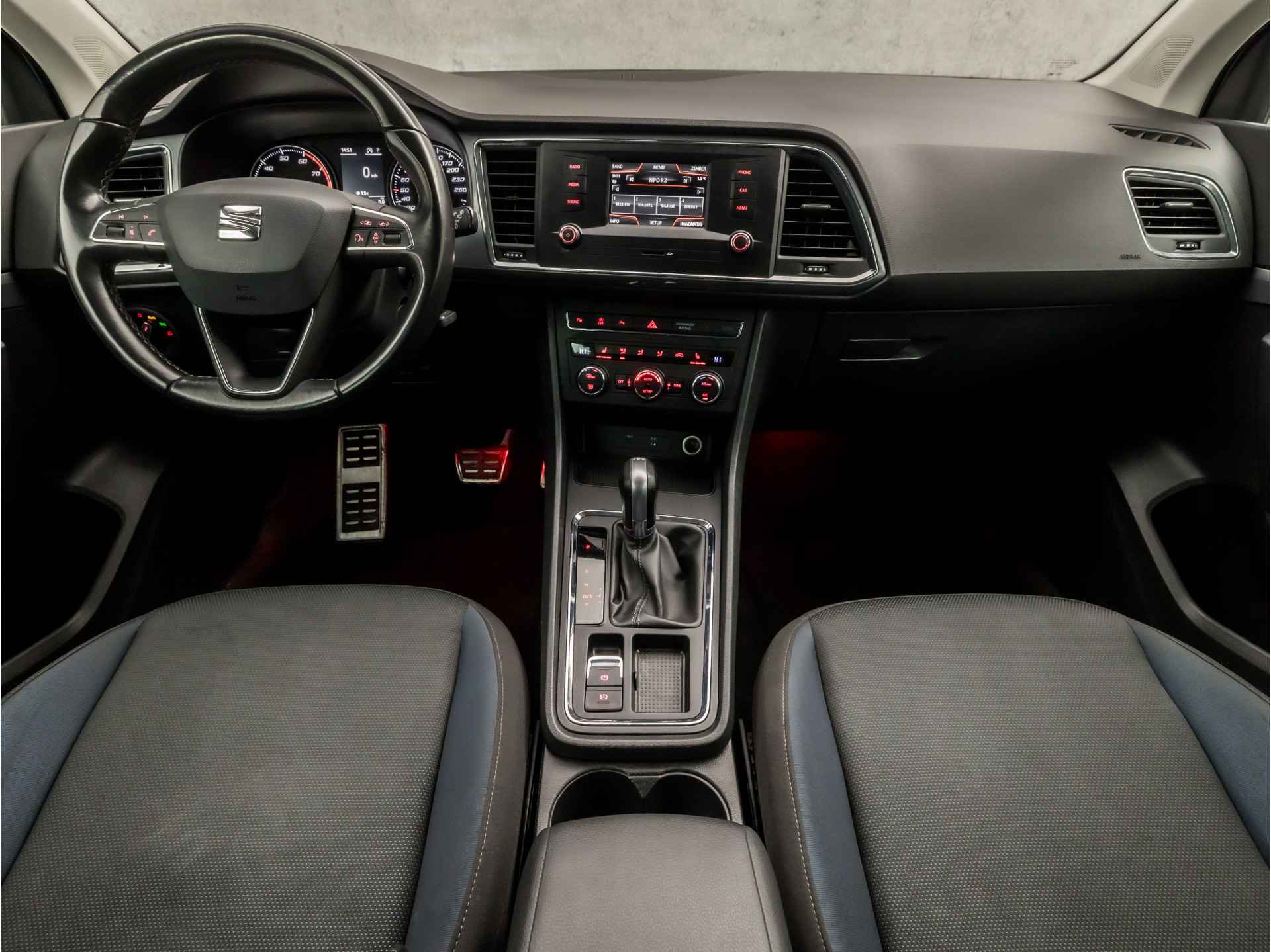 Niets achter deze auto blijft verborgen door de achteruitrijcamera. Een veilig gevoel! Spraaksturing is onderdeel van de uitrusting van deze auto. Met uw stem kunt u de belangrijkste voertuigfuncties bedienen. Deze auto gaat met u in gesprek. Hij vertelt u dankzij remote services alles over de status van diverse onderdelen en laat zich desgevraagd ook activeren. Gewoon via uw smartphone. De automatische airconditioning zorgt voor een prettige binnentemperatuur. Het drukke verkeer eist onderweg al uw aandacht op. Daarom is het goed dat deze SEAT is voorzien van diverse systemen die u assisteren tijdens de rit. Een automatisch inschakelbare verlichting neemt het waar als het donker wordt of gaat schemeren, en schakelt dan automatisch de verlichting in. Op dezelfde manier "ziet" de regensensor de eerste spatjes regen en schakelt dan de ruitenwissers in, en als het harder gaat regenen zet hij de ruitenwissers ook in een snellere stand. De uitrusting van deze SEAT is met sportstuur met schakelpaddels, cruise control, buitentemperatuurmeter, automatisch dimmende binnenspiegel, isofix-aansluiting en centrale deurvergrendeling met afstandsbediening behoorlijk compleet.