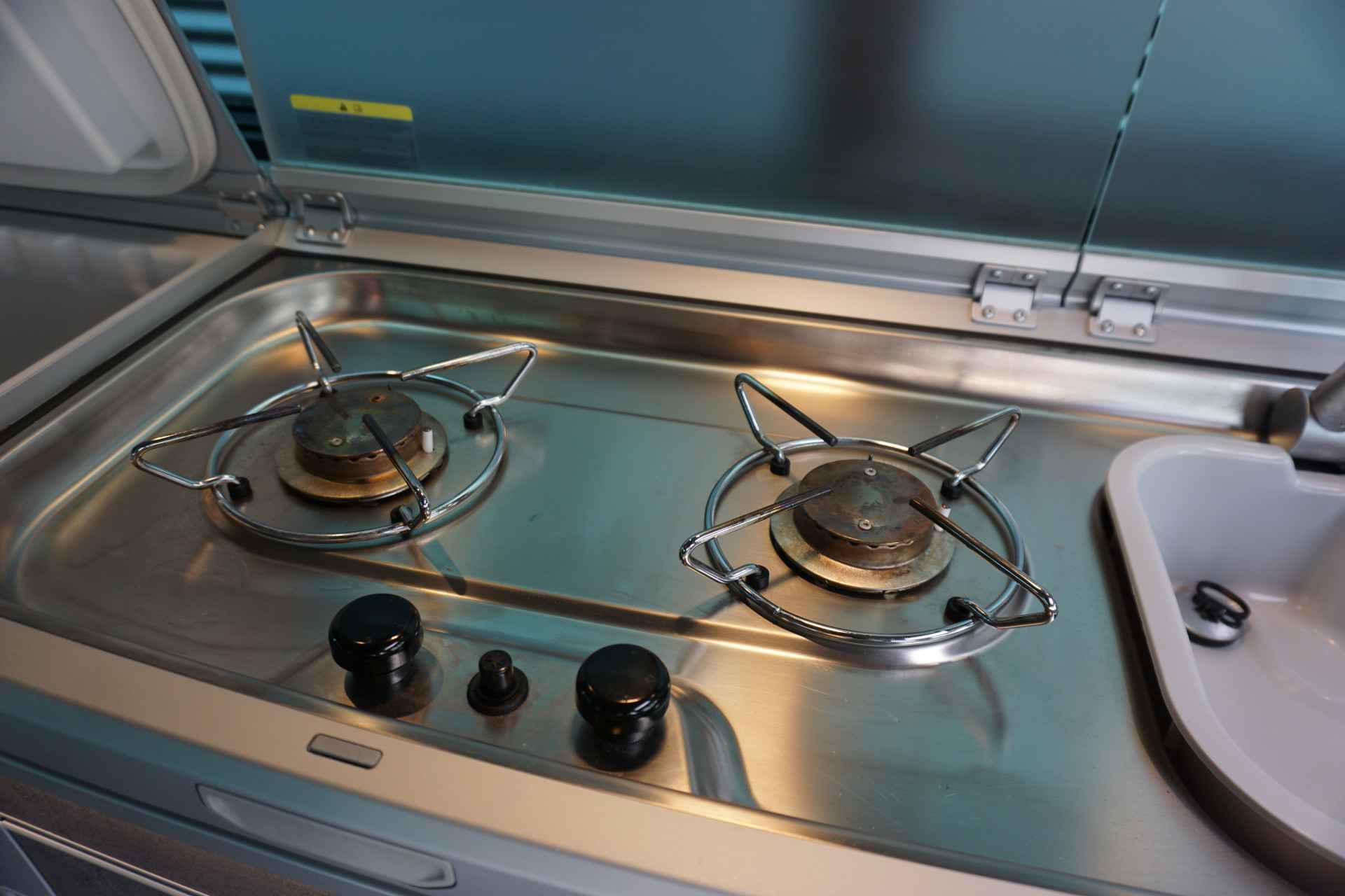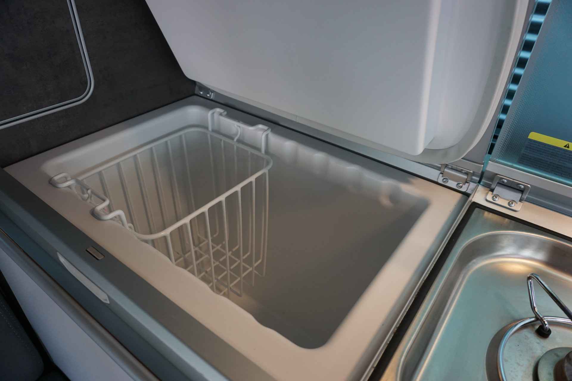 Keuken in Graphite Grey met kookplaat, koelkast (42L) en buitendouche-aansluiting