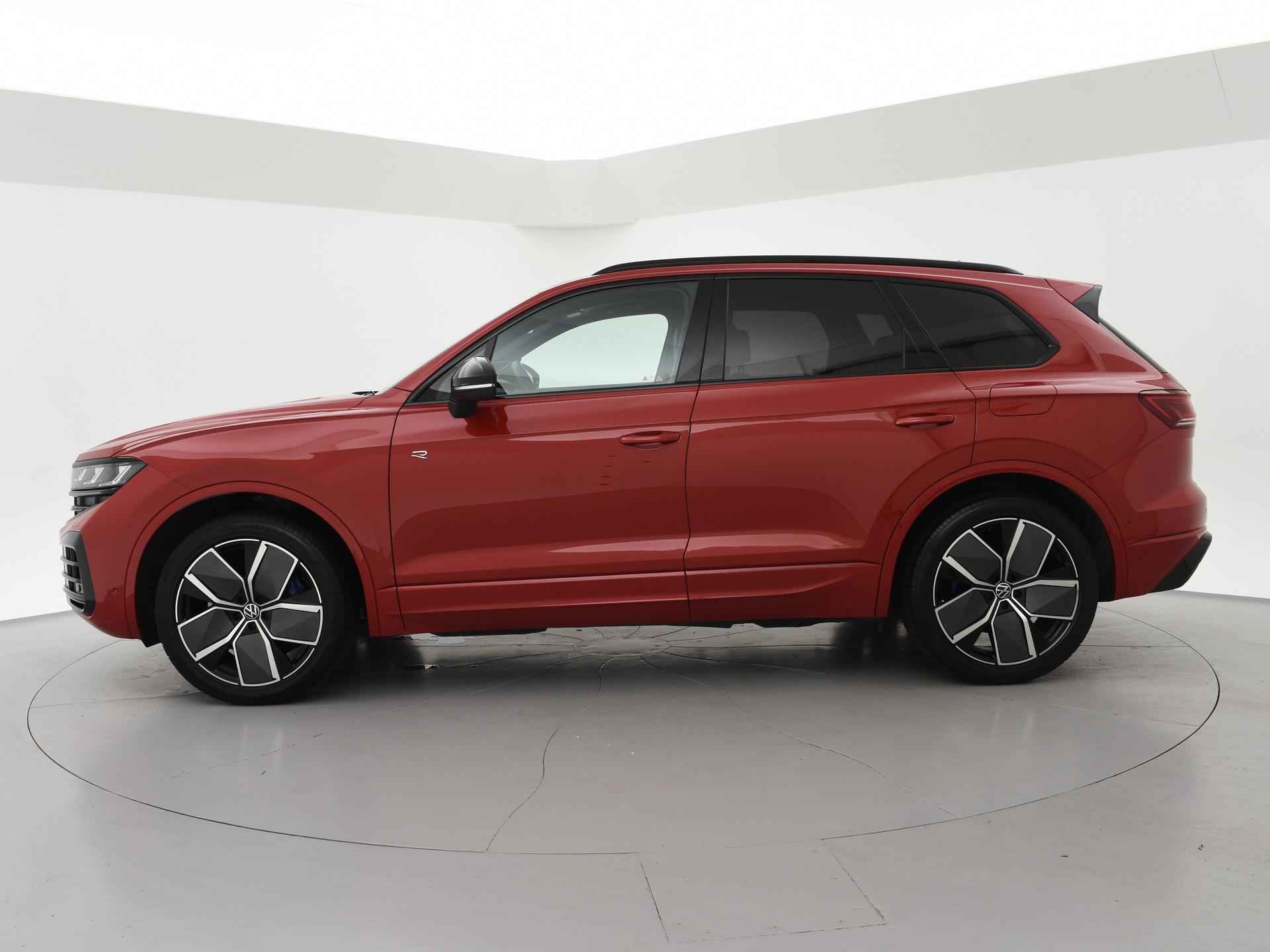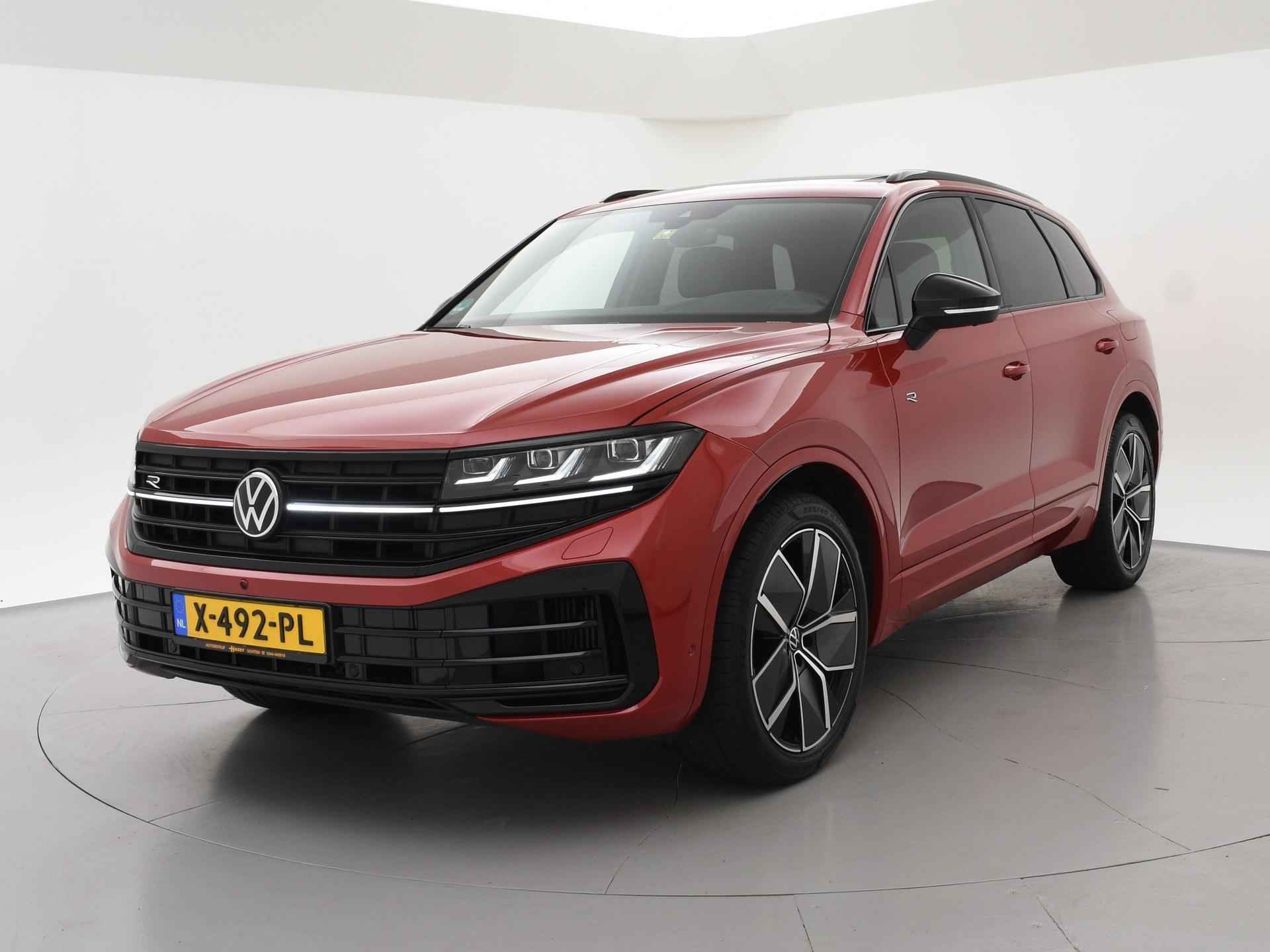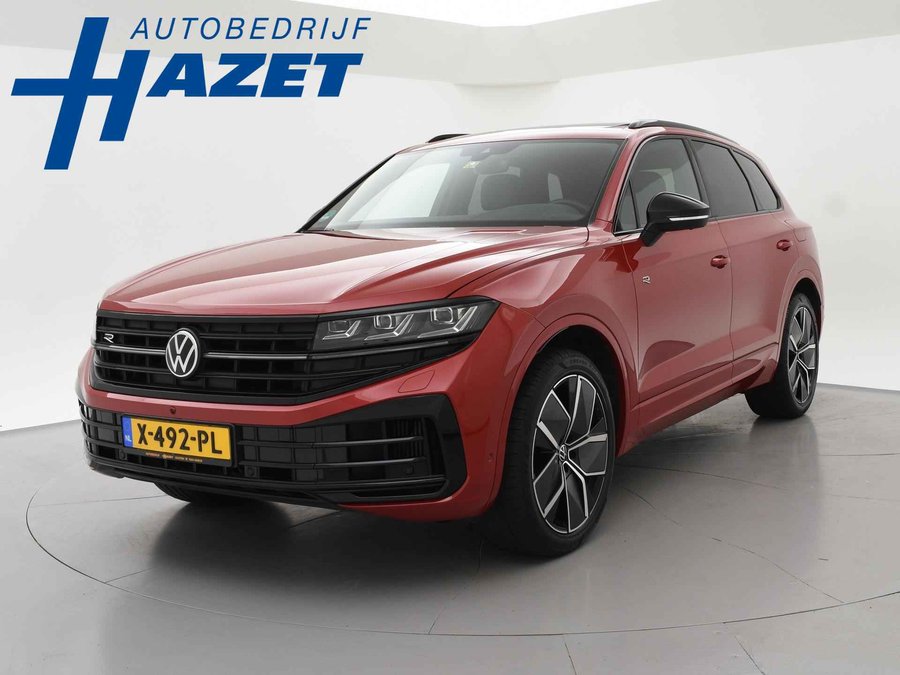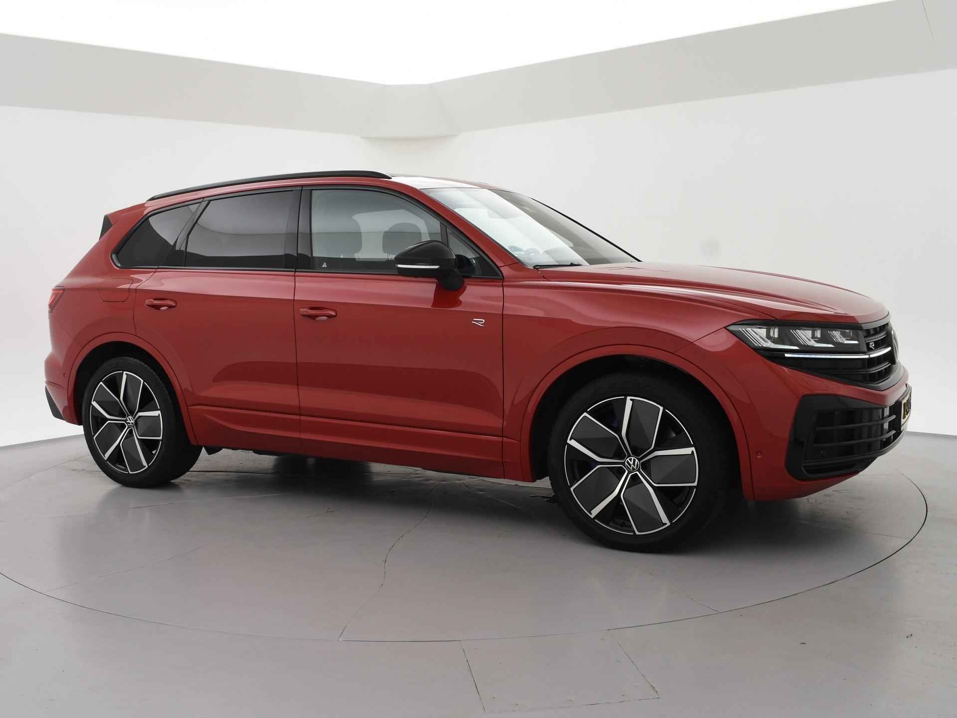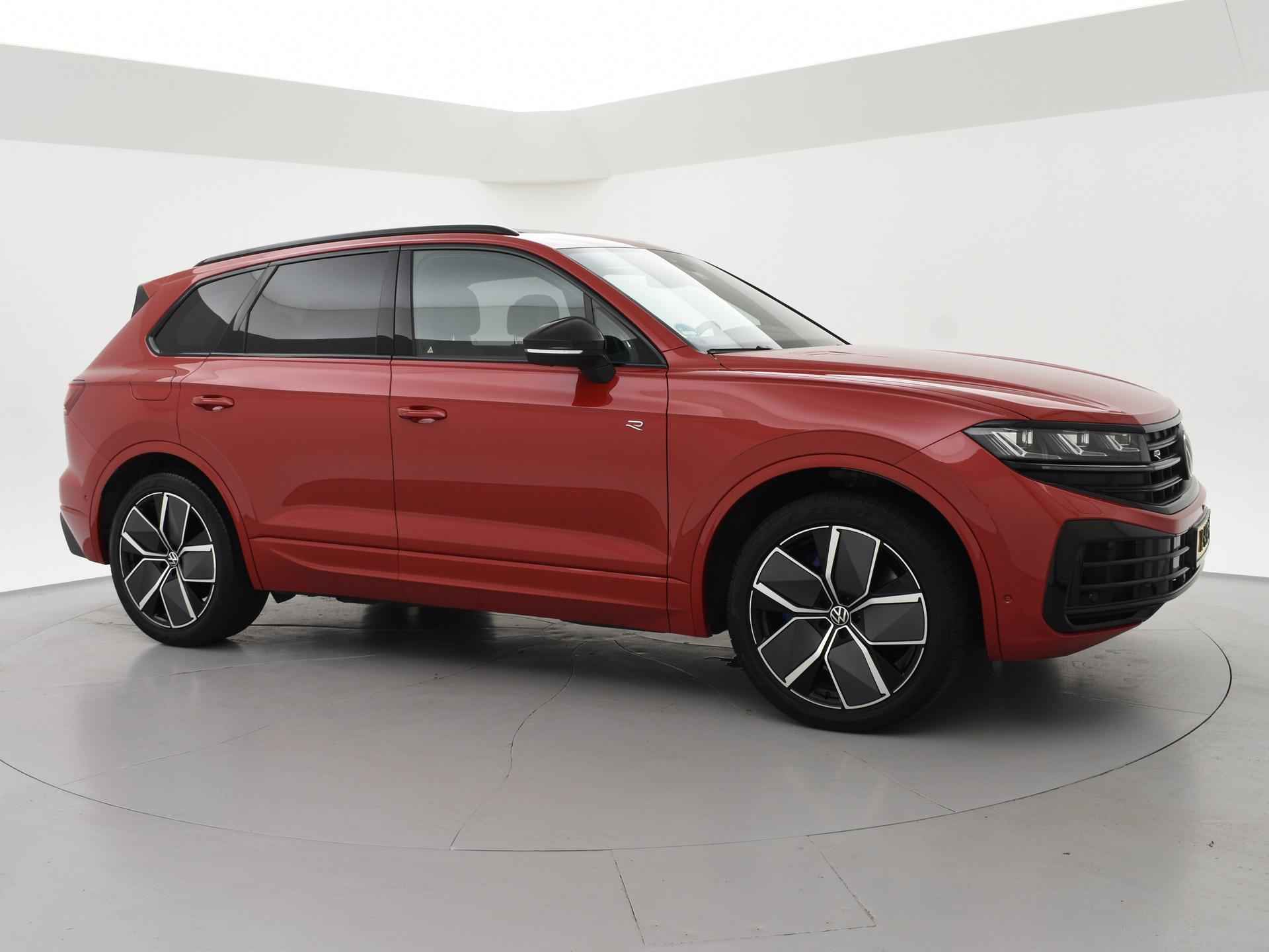 Origineel Nederlandse en 1e eigenaar Touareg R van 2024, BTW verrekenbaar, Door ons zelf nieuw geleverd, nieuwprijs was 111.147 euro. 3.0 TSI V6 e-Hybrid plug-in hybride 462 PK 4motion automaat in de unieke kleur Chili Red parelmoer, Puglia Ergo Vienna zwart leder R design interieur met blauw stiksel, Lederen interieur/dashboard delen met blauw stiksel, Servosluiting portieren, Extra getinte achterruiten, 21 inch Leeds Bi-Color lichtmetalen velgen, Assistance Pakket met 360 graden rondom zicht camerasysteem, Panorama schuif/kanteldak, Sfeerverlichting interieur met verschillende kleuren, Luchtvering met regelbare hoogte, Stoelventilatie, Stoelverwarming voor + achterin, Adaptive cruise control, Digitale cockpit, Apple Carplay / Android Auto appstreaming Google Maps, Flitsmeister, Spotify etc, Elektrische achterklep, Keyless-entry en keyless-drive, Full LED verlichting rondom, Alarm klasse 5, Head-up display, 4-zone climate control met aparte bediening achterin, Lijnassistentie, Dodehoek assistentie, Verkeersbordenherkenning, DAB digitale radio, Elektrische stoelverstelling met geheugen,