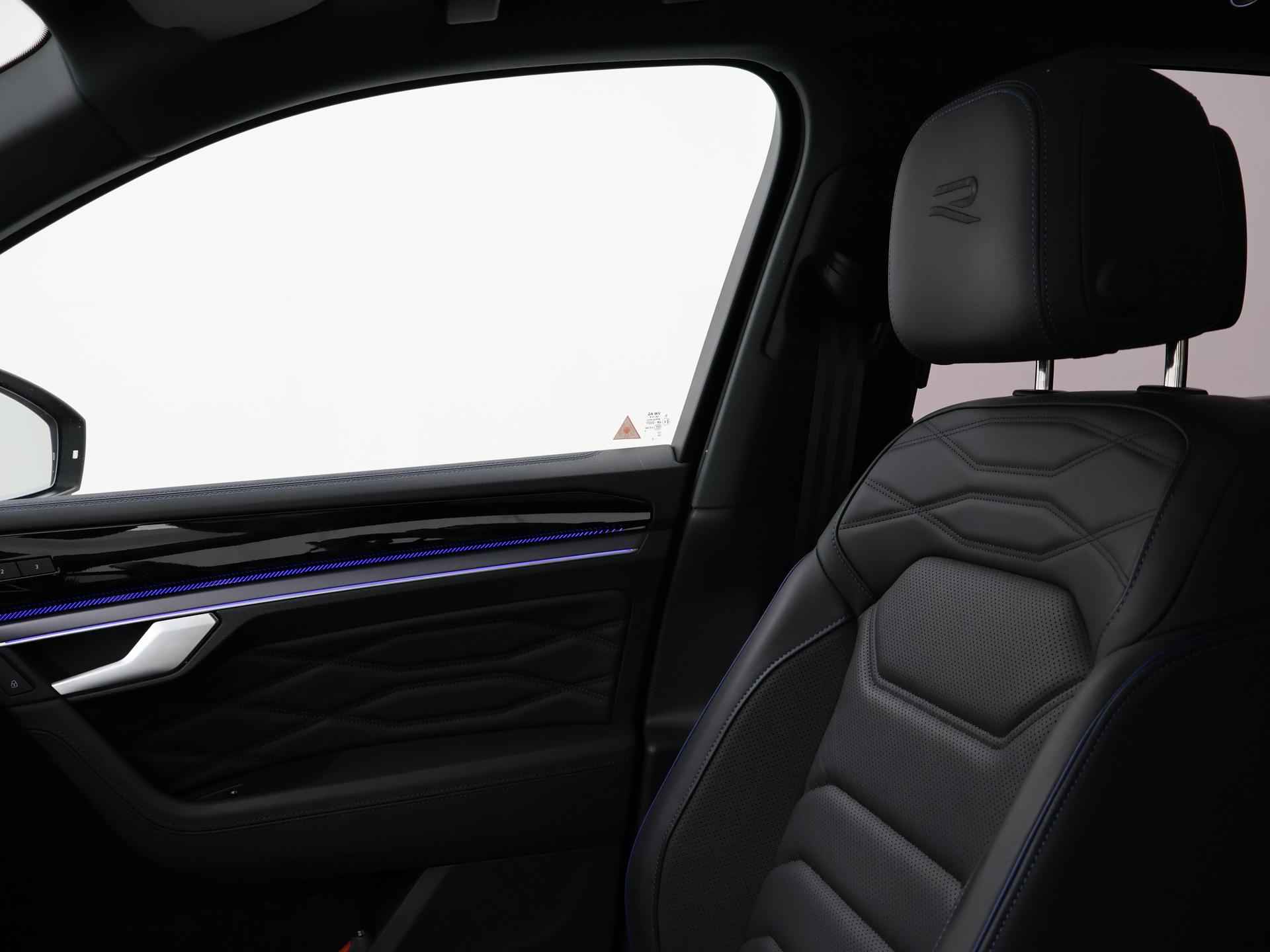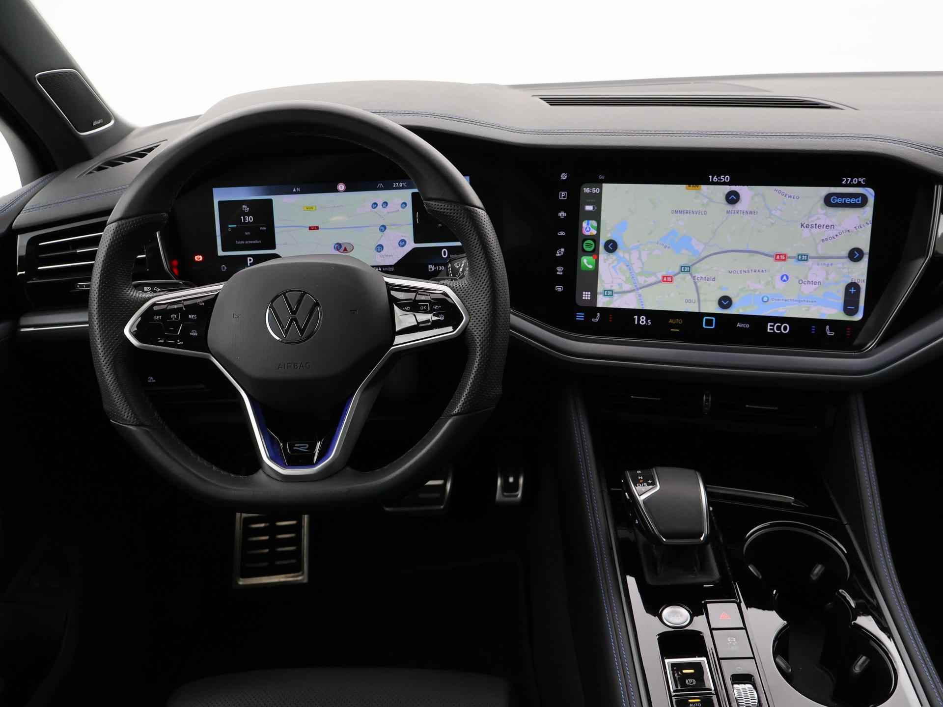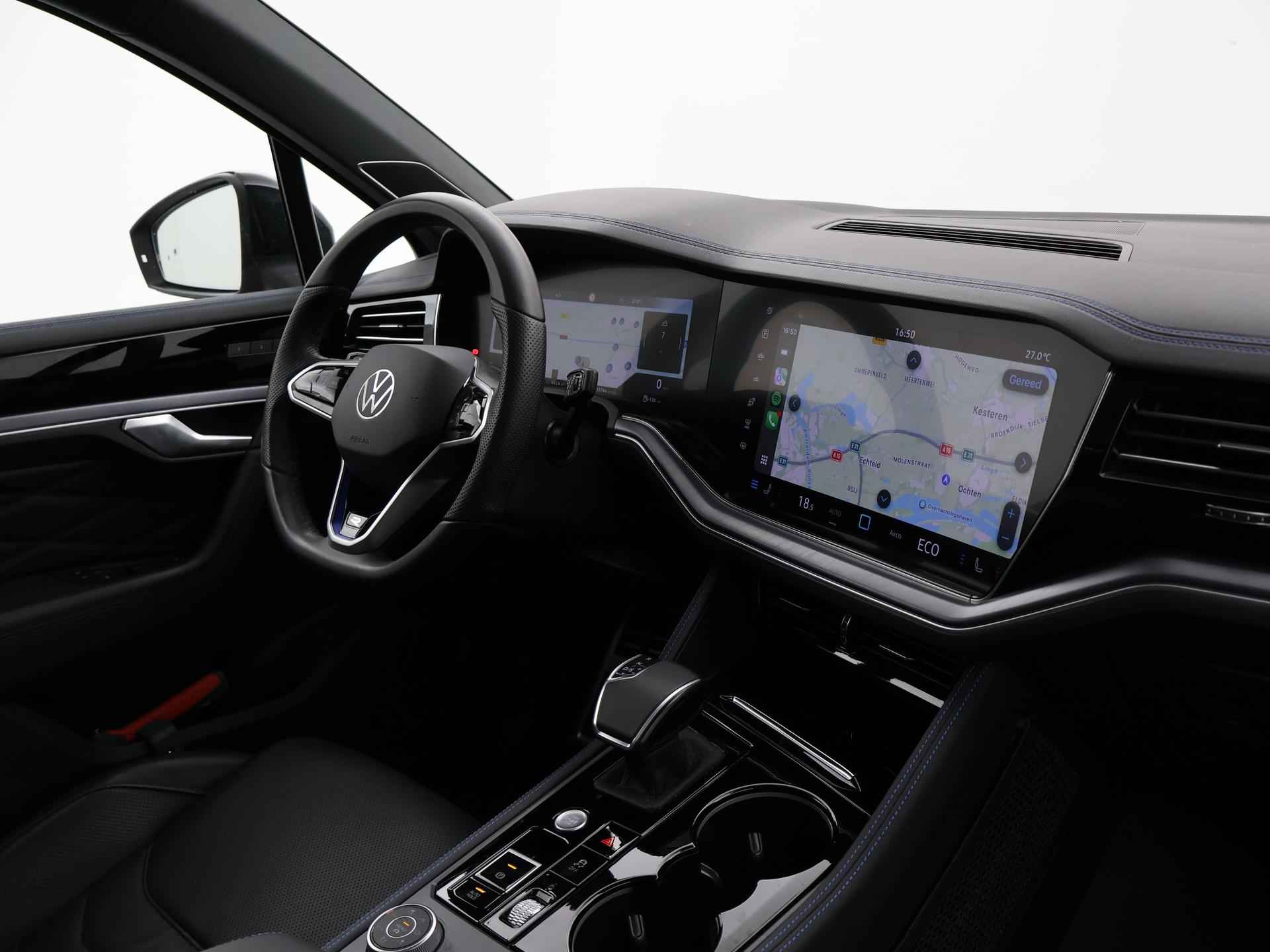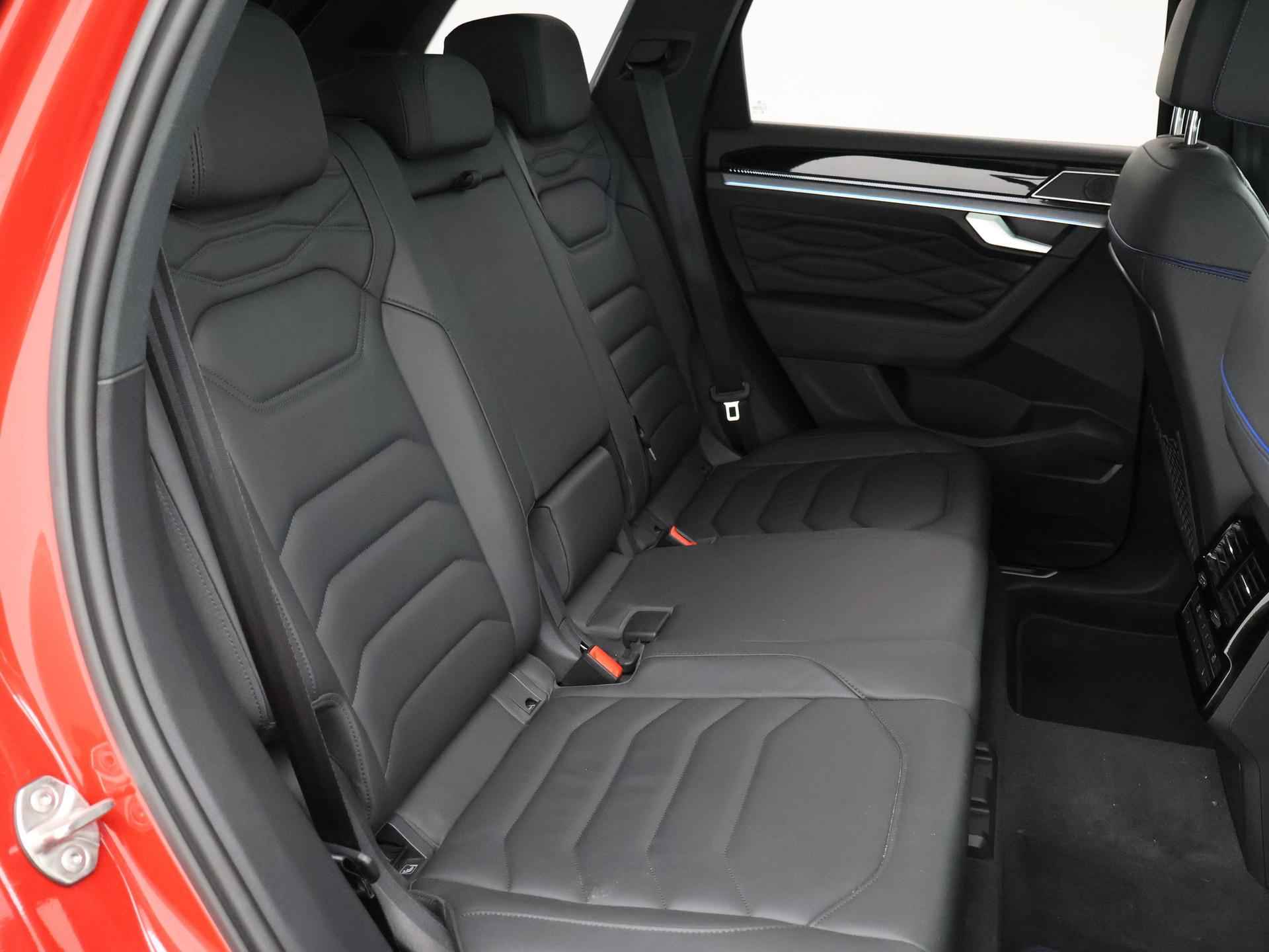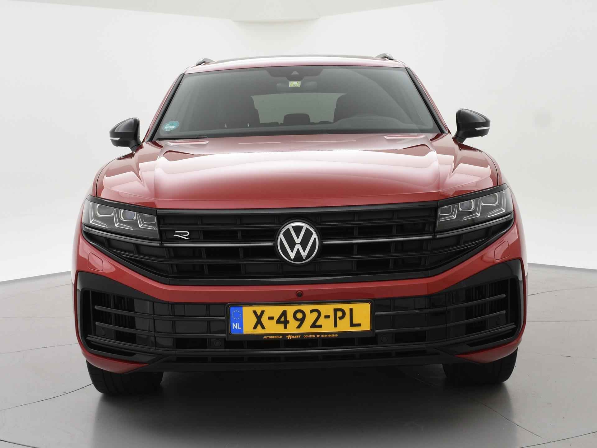 Origineel Nederlandse en 1e eigenaar Touareg R van 2024, BTW verrekenbaar, Door ons zelf nieuw geleverd, nieuwprijs was 111.147 euro. 3.0 TSI V6 e-Hybrid plug-in hybride 462 PK 4motion automaat in de unieke kleur Chili Red parelmoer, Puglia Ergo Vienna zwart leder R design interieur met blauw stiksel, Lederen interieur/dashboard delen met blauw stiksel, Servosluiting portieren, Extra getinte achterruiten, 21 inch Leeds Bi-Color lichtmetalen velgen, Assistance Pakket met 360 graden rondom zicht camerasysteem, Panorama schuif/kanteldak, Sfeerverlichting interieur met verschillende kleuren, Luchtvering met regelbare hoogte, Stoelventilatie, Stoelverwarming voor + achterin, Adaptive cruise control, Digitale cockpit, Apple Carplay / Android Auto appstreaming Google Maps, Flitsmeister, Spotify etc, Elektrische achterklep, Keyless-entry en keyless-drive, Full LED verlichting rondom, Alarm klasse 5, Head-up display, 4-zone climate control met aparte bediening achterin, Lijnassistentie, Dodehoek assistentie, Verkeersbordenherkenning, DAB digitale radio, Elektrische stoelverstelling met geheugen,
