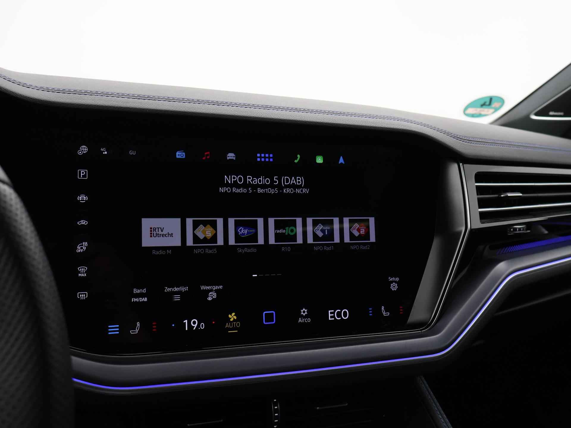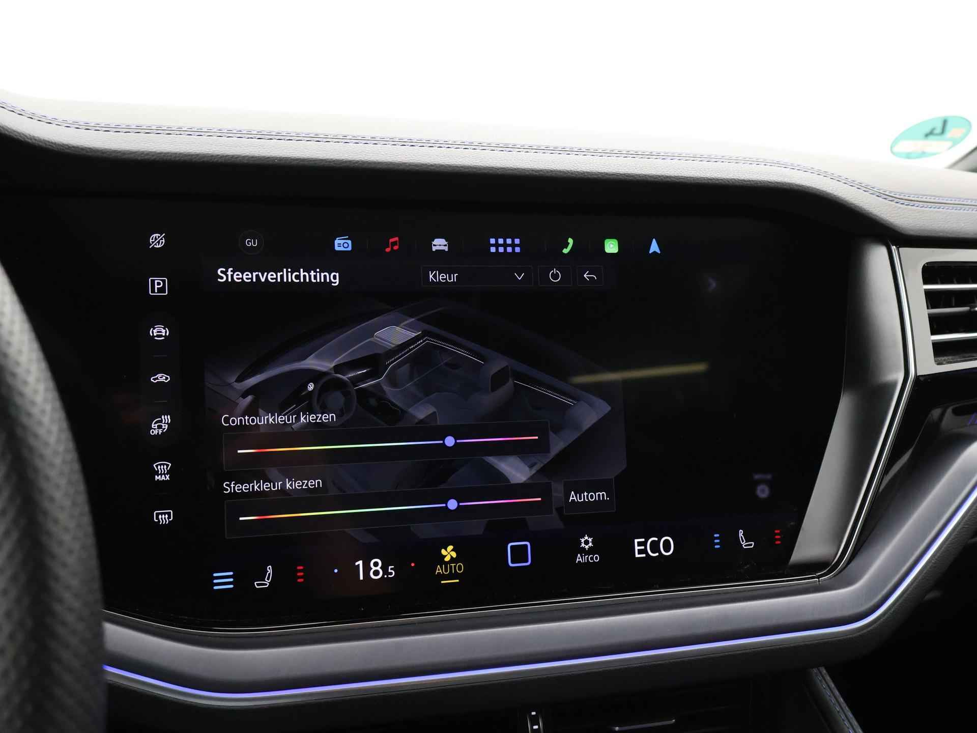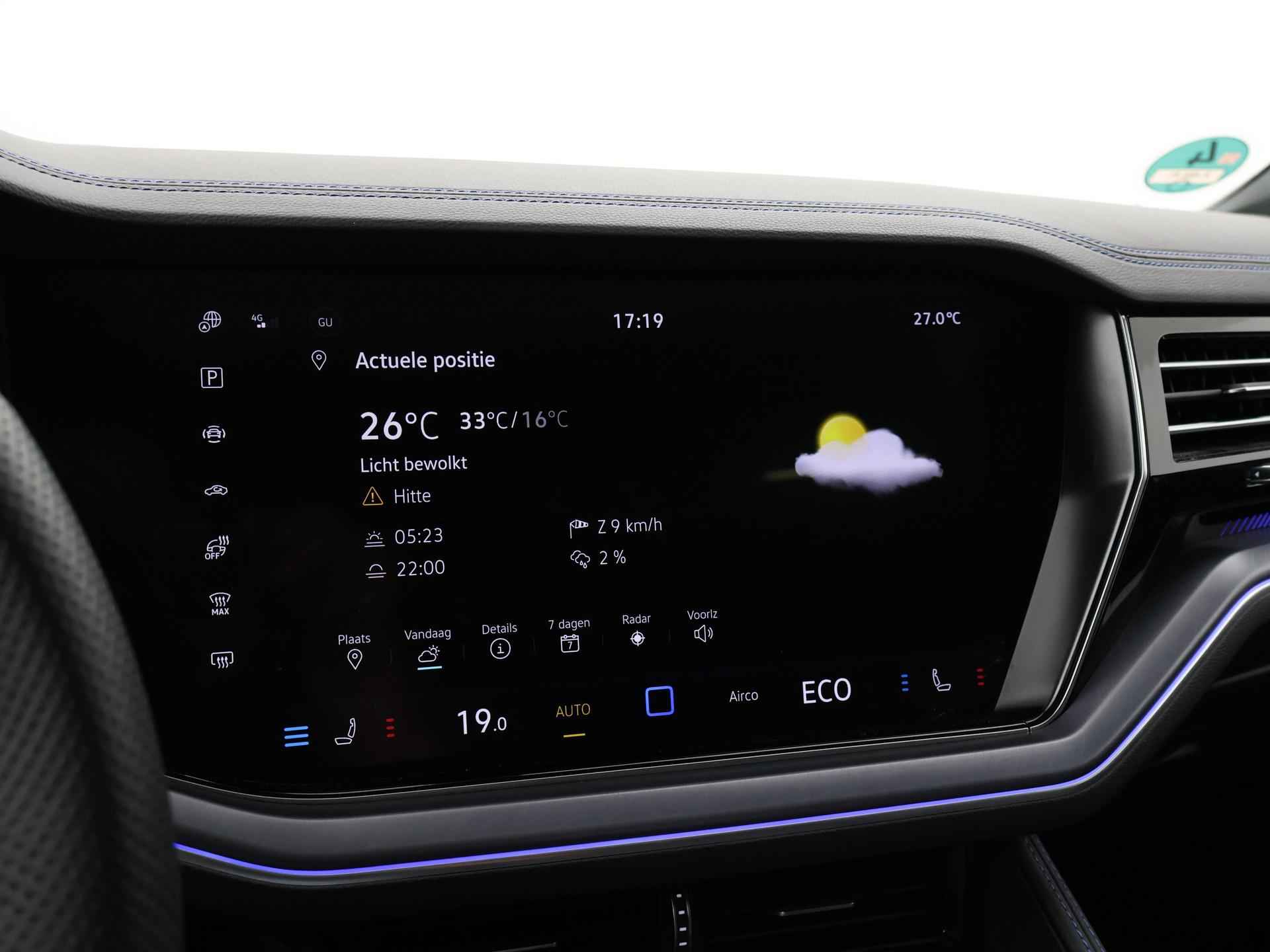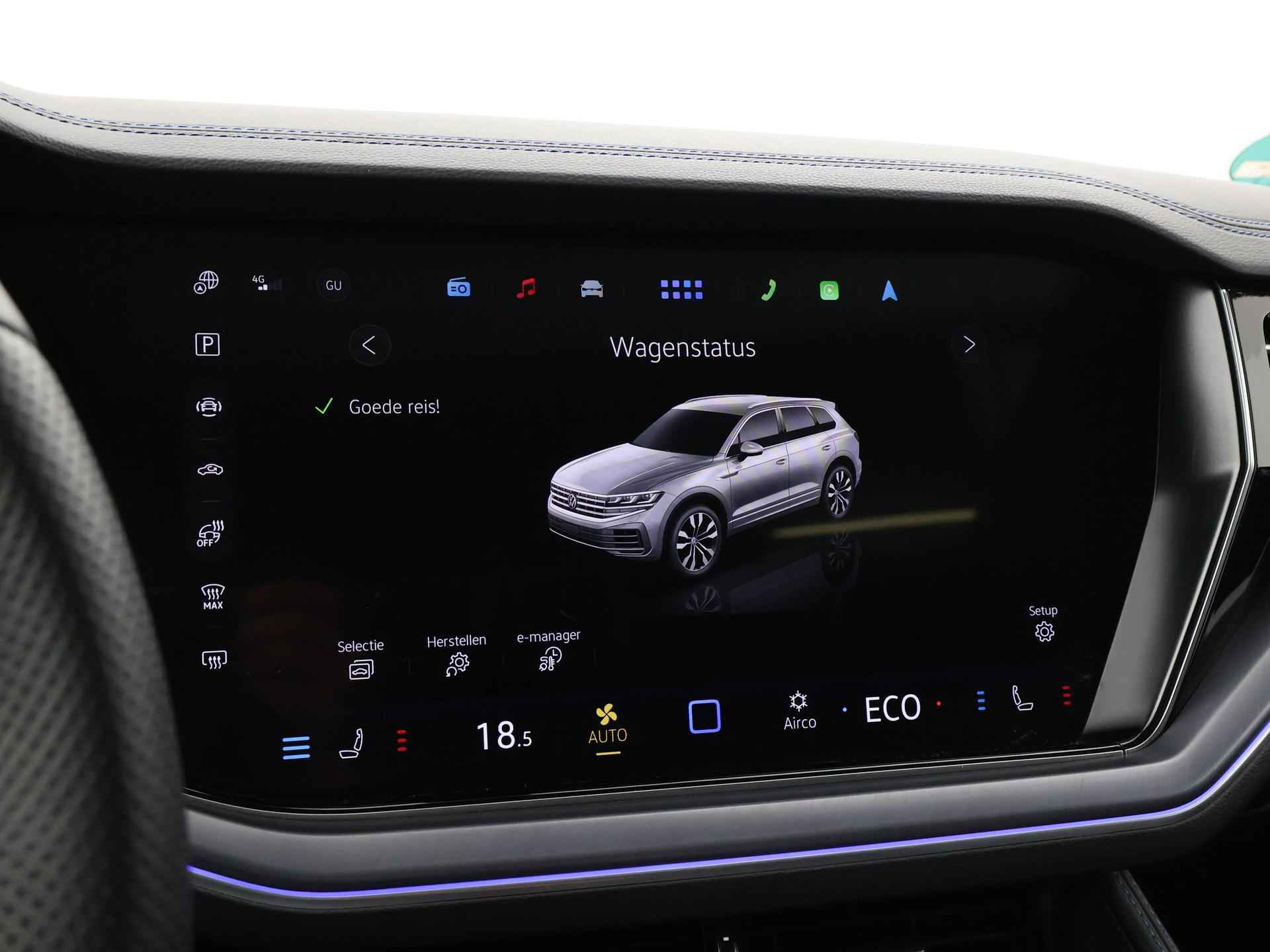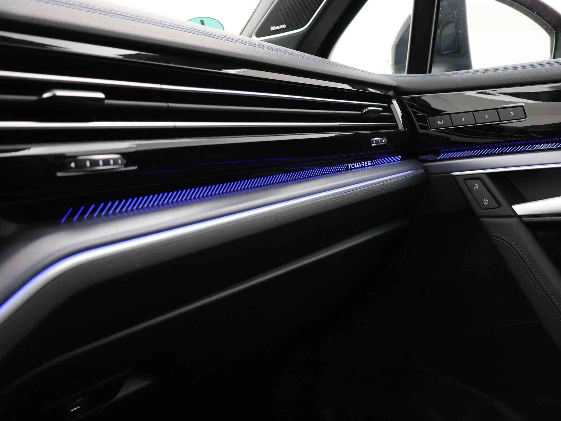 Origineel Nederlandse en 1e eigenaar Touareg R van 2024, BTW verrekenbaar, Door ons zelf nieuw geleverd, nieuwprijs was 111.147 euro. 3.0 TSI V6 e-Hybrid plug-in hybride 462 PK 4motion automaat in de unieke kleur Chili Red parelmoer, Puglia Ergo Vienna zwart leder R design interieur met blauw stiksel, Lederen interieur/dashboard delen met blauw stiksel, Servosluiting portieren, Extra getinte achterruiten, 21 inch Leeds Bi-Color lichtmetalen velgen, Assistance Pakket met 360 graden rondom zicht camerasysteem, Panorama schuif/kanteldak, Sfeerverlichting interieur met verschillende kleuren, Luchtvering met regelbare hoogte, Stoelventilatie, Stoelverwarming voor + achterin, Adaptive cruise control, Digitale cockpit, Apple Carplay / Android Auto appstreaming Google Maps, Flitsmeister, Spotify etc, Elektrische achterklep, Keyless-entry en keyless-drive, Full LED verlichting rondom, Alarm klasse 5, Head-up display, 4-zone climate control met aparte bediening achterin, Lijnassistentie, Dodehoek assistentie, Verkeersbordenherkenning, DAB digitale radio, Elektrische stoelverstelling met geheugen,
