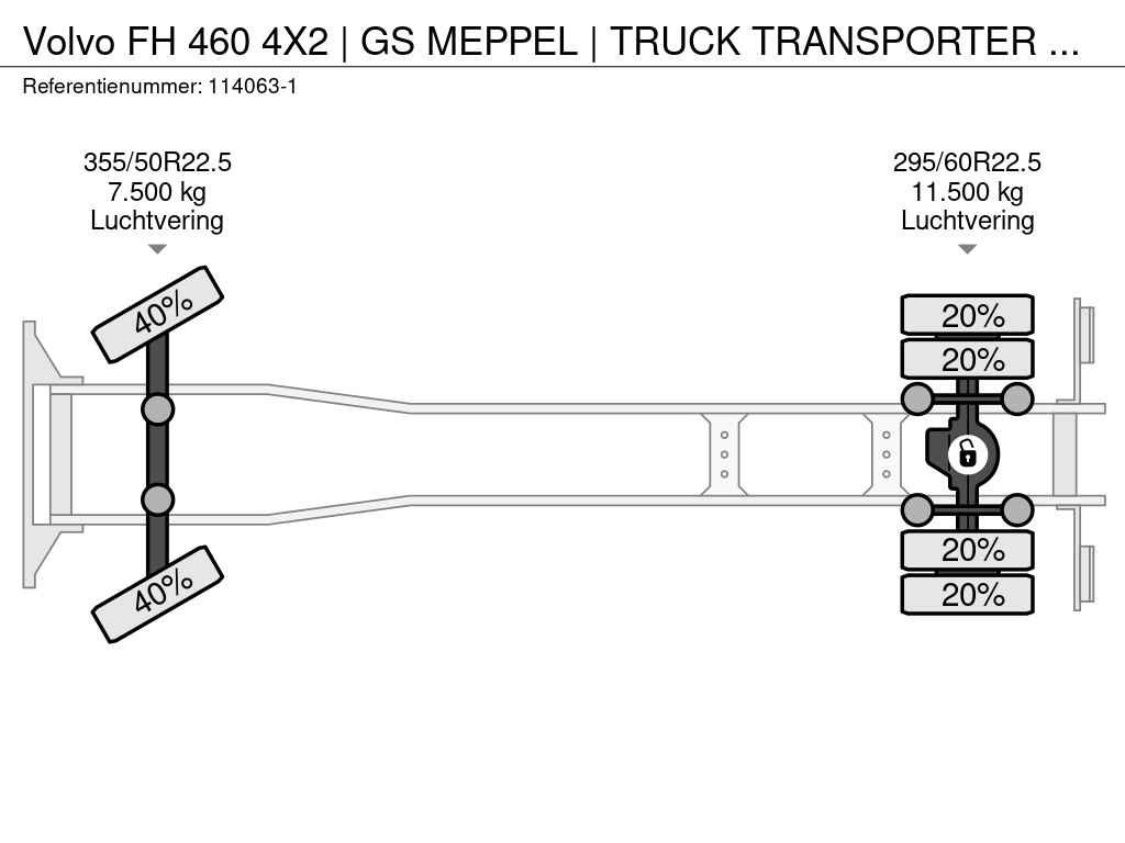 For sale: Make and model: Volvo FH460 Wheel formula: 4x2 First registration: 27-05-2016 TUV valid: 02-06-2026 VIN: YV2RTY0AXGB771852 Mileage: 1.101.200 km Construction: Tractor + truck transporter Wheelbase: 3.8 m GVW: 19.00 kg CVW: 50.000 kg Empty weight: 8.120 kg Loading capacity: 10.980 kg Engine: Power: 345 KW / 460 HP Cylinders: 6 Capacity: 12.777 cm3 Emission standard: EURO 6 Gearbox: I-shift Suspension | Weights | Tyres: 1st Axle: Air | 7.500 kg | 355/50R22.5 40% 2nd Axle: Air | 11.500 | 295/60R22.5 20% General specifications: Differential lock Ad blue 2 diesel tanks PTO Hydraulic system Engine brake Air horns LED working lights Rotating beacons on roof Extra lights in grill Cabin specifications: Airco /climate control Parking heating/ webasto Radio 27 MC Refrigerator Parking airco Leather seats Cruise control Power converter Lane assist Collision assist 2 beds Garmin Trailer specifications: Make and model: GS Meppel O-120-2400TRU First registration: 23-05-2013 VIN: XL908003111004003 GVW: 36.000 kg Empty weight: 11.980 kg Loading capacity: 24.020 kg Front lift with hydraulic extension Extendable center Raising center deck Extendable rear Safety locks on cylinders Aluminium ramps Suspension | Weights | Tyres: 1st Axle: Air | 8.000 kg | 215/75R17.5 20% 2nd Axle: Air | 8.000 kg | 245/70R17.5 20% 3rd Axle: Air | 8.000 kg | 205/65R17.5 20% Of course, we have more pictures and information available, and we are looking forward to helping you. Worldwide delivery is possible! For more information, please contact our sales department: Office: 0031-527246140 Mobile/ Whatsapp : 0031 6 55345643 Mail : wilco@hulleman.com web: www.hulleman.com Hulleman Trucks B.V. D.P.A. Weeversstraat 2 8316 GG Marknesse - Holland